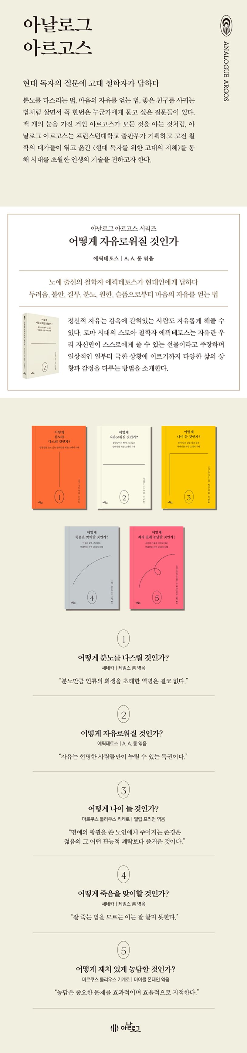 어떻게 분노를 다스릴 것인가? 어떻게 자유로워질 것인가? 어떻게 나이 들 것인가? 어떻게 죽음을 맞이할 것인가? 진실된 우정은 어떻게 쌓을 수 있으며 열린 마음을 유지하려면 어떻게 해야 하는가? 근본적으로 더 나은 삶을 추구하기 위해, 사람들은 먹고사는 문제에서 벗어나 더 높은 차원의 질문을 던질 때가 있다. 그렇다면 이런 질문에 대한 답은 어디서 구할 수 있을까? 아날로그 아르고스 시리즈는 고대 철학에서 그 답을 찾는다.