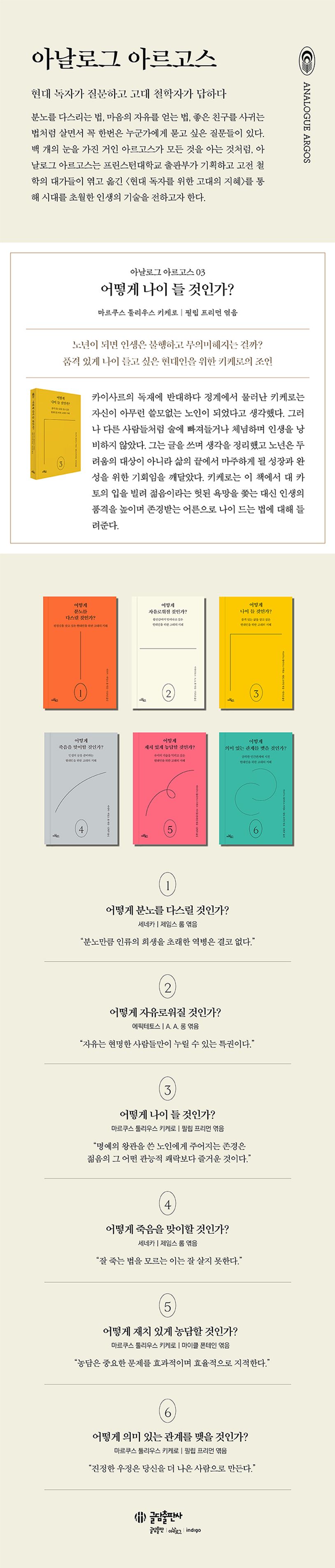 노년은인생에서가장비참한시기인가,인생의성장과완성을위한최고단계인가?사람들은대부분나이드는것을바라지않는다.거부할수없는자연의섭리인데도젊음만을가치있는것으로여겨어떻게든젊어보이려고애쓴다.늘어나는흰머리와얼굴의주름을감추고빈말인줄알면서도젊어보인다는말을들으면기뻐한다.우리는왜나이드는것에대해이토록거부감을느끼는걸까?고대로마의철학자이자정치가였으며,수많은저작을남긴저술가이자뛰어난웅변가였던마르쿠스툴리우스키케로는노년에대한오해와두려움이이시기를비참하게느끼도록만든다고말한다.공화주의자였던키케로는끝까지자신의뜻을굽히지않고,카이사르의독재에반대하다가정계에서영향력을상실하고로마에서멀리떨어진시골로물러나게된다.한동안그는자신이쓸모없는노인이되었다고생각했다.그러나술에빠져들거나낙담하여인생을허비하는대신깊은사유를통해역사에오래남을책들을쓰기시작한다.아침부터늦은밤까지글쓰기에전념해정부,윤리학,교육,종교,우정,도덕적의무등다양한주제에관한글을썼고,기원전44년카이사르가암살당하기직전부터「노년에관하여」를쓰기시작했다.키케로이전에도노년에대해이야기하는글이있었다.대개는사라진젊음을슬퍼하거나불평을입에달고사는피곤한사람또는세상에서가장지혜로운사람등한가지특징만을강조했다.그러나키케로는매우다양한관점에서노년을바라보고그를둘러싼오해와편견을하나하나짚어가며현명하고격조높은삶을추구하는사람들에게어째서노년이인생의최고단계가될수있는지를들려준다.“이기적이고성마른사람들은나이와상관없이인생의어느시기에나불행한법이지!”-품격있게나이들고싶은사람들을위한키케로의조언이책에는품격있게나이들기위한7가지질문과답이담겨있다.키케로는자신이가장존경하는대카토(CatotheElder)의입을빌려청년스키피오,라엘리우스와대화하는형식으로이야기를구성했는데,가장먼저‘노년은인생에서가장불운한시기인가?’라는질문을통해노년에대한일반적인편견을바로잡는다.쾌락없는삶이허망하다며한탄하고젊은이들이자신을홀대한다고불평하는사람들을향해이렇게이야기한다.“그런불평은모두나이탓이아니라성격탓이네.사리분별을알고친절하고자비로운노인들은늙는것도잘감당한다네.이기적이고성마른사람들은나이와상관없이인생의어느시기에나불행한법이지.”‘노년이되면활동적인삶에서멀어지는가?’라는질문에대한답으로는‘활동적’이라는것이육체의활동뿐아니라정신의활동까지포함한다면,노년은지혜와영향력을충분히활동적인삶을영위할수있다고말한다.또한허약해진육체가지닌한계를인정하면서그것은자연이정해놓은길이므로전혀슬퍼할일이아니라고말한다.각자의나이에어울리는특성들이있다는것이다.“삶의길은정해져있네.자연의길은하나뿐이고자네들은그길을오직한번만갈수있네.인생의단계마다그에따른특성들이있네.아이때는약함이,청년일때는대담함이,중년에는진지함이,노년에는원숙함이있네.이것들은제철에수확해야하는과일같은것이네.”무엇보다이책에서키케로가전하는가장중요한가르침은‘어떻게해야존경받을수있는가?’일것이다.이야말로품격있는삶을완성하기위한중요한질문이아닐까?키케로는“노년의최고영예는존경”이라고말한다.그러면서“노년의엄격함은이해할수있지만까탈스러움은미덕이될수없다”고말한다.“명예의왕관을쓴노인에게주어지는존경은젊음의어떤관능적쾌락보다도더즐거운것이라네.…주름이지고머리칼이하얗게세었다는것만으로갑자기존경을받게되지는않네.젊은시절을잘보낸사람만이노인이되었을때멋지고놀라운결실을수확하게된다네.”“이책을읽으면늙고싶은생각이든다.”나이듦에대한두려움을기대로바꿔주는책“이책을읽으면늙고싶은생각이든다.”몽테뉴가「노년에관하여」를읽고한말이다.또한미국의건국선조존애덤스도만년에여러번반복해읽을정도로이책을좋아했고,성아우구스티누스에서미국의3대대통령토머스제퍼슨에이르기까지수많은독자들이2천년이상이책에서기쁨과영감을받았다고한다.우리는어떻게젊어보일지를고민하는대신어떻게존경받는어른으로나이들것인지를고민해야하지않을까?영원한젊음이라는헛된욕망을쫓느라현재의시간을제대로살고있지못한오늘날의독자들에게도키케로가건네는인생의조언은여전히유효할것이다.