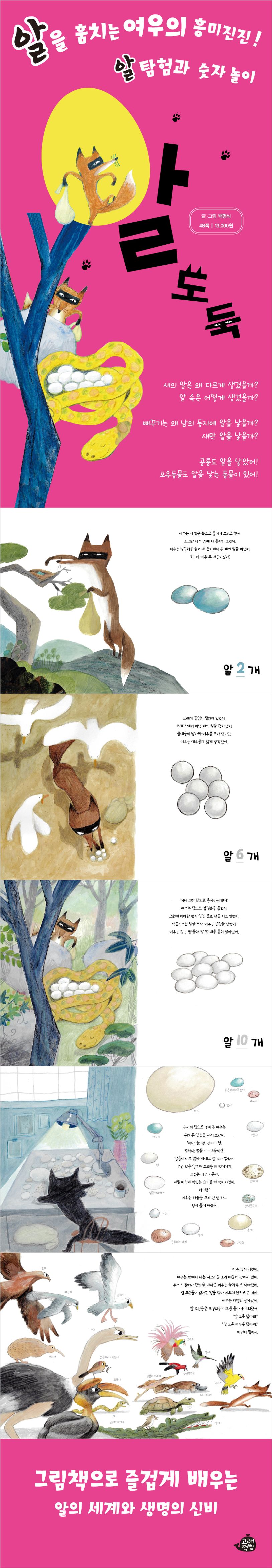 작품은 알을 탐하는 알 도둑인 여우가 이곳저곳을 탐험하며 펼쳐집니다. 여우는 도둑이지만 익살스럽고 밉지만은 않습니다. 여우는 알을 찾아 탐험하며 여러 동물의 알을 만나고 보여줍니다. 알에는 우리가 알지 못하는 신비로운 이야기가 담겨 있습니다. 이야기는 이 알을 수와 연결하여 흥미를 더해 줍니다. 이야기 끝에는 부록을 실어 알의 구조와 생김새, 특징 등 신비로운 알의 세계를 깊이 있게 알려주고 있습니다.