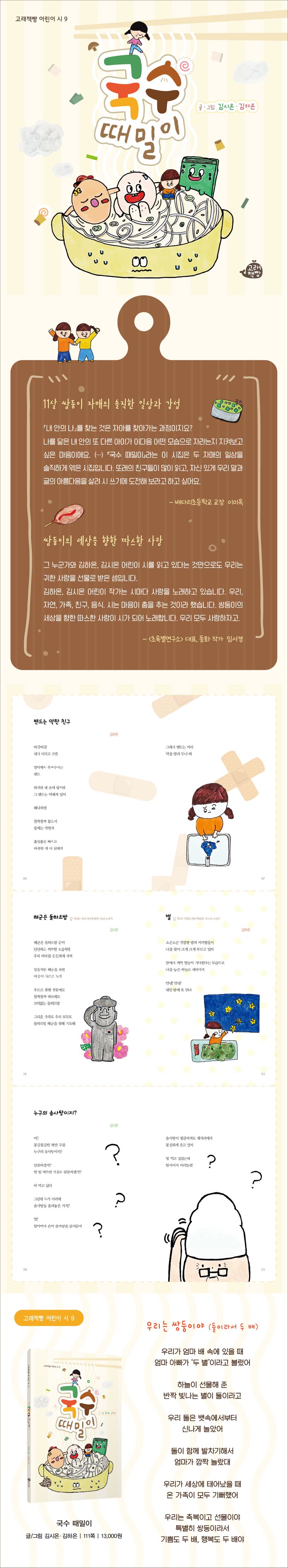 11살 쌍둥이 자매의 솔직하고 감수성 풍부한 시와 그림을 엮었습니다. 고래책빵 어린이 시 아홉 번째입니다. 쌍둥이인 두 어린이의 시 80여 편을 5부로 나누어 실었습니다. 제1회 ‘목일신캠프백일장’과 제6회 ‘해군호국문예제’ 수상작을 수록해 쌍둥이의 시 세계를 더 깊이 있게 만날 수 있습니다.