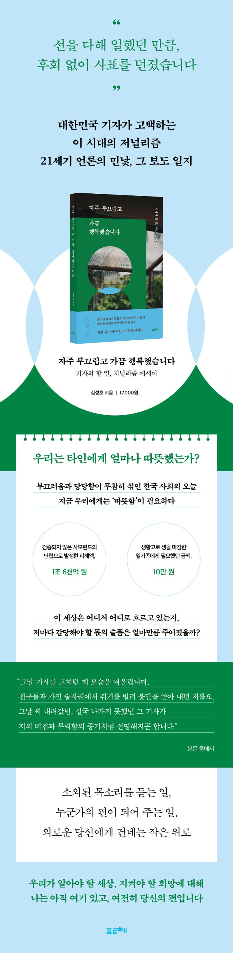 “오늘날 기자를 한다는 건, 그 모든 무력함과 한심함 사이에서 나를 지키는 일”이라는 저자는 언제 어디서든 부지기수로 무너지는 자긍심을 꼿꼿하게 세우려 노력했다. 《자주 부끄럽고 가끔 행복했습니다》는 저널리즘 상실 시대에 자주 부끄러워지는 우리가, 가끔 행복하기 위해 끊임없이 이야기하고 들어야 한다는 기자의 자조적 고백이다. 저자는 《자주 부끄럽고 가끔 행복했습니다》를 통해 사라지는 저널리즘에 관해 낱낱이 드러내며, 우리가 지켜야 할 저널리즘이란 무엇인가를 말한다. 책에 담긴 기자의 유려한 문장과 섬세한 시선은 출판사 편집부 전원을 감동하게 했고, 동시에 그의 다음 행보를 걱정시킬 만큼 통렬하고 솔직했다. 이 책은 오늘날 삼선 슬리퍼를 신었다는 이유로 박대당한 기자와 한쪽 프레임에 초점 맞추기 급급한 기레기 사이에서 ‘저널리즘이란 무엇인지’ 우아하게 한 방 먹이고 있다. “당신들이 기자냐?”라고.