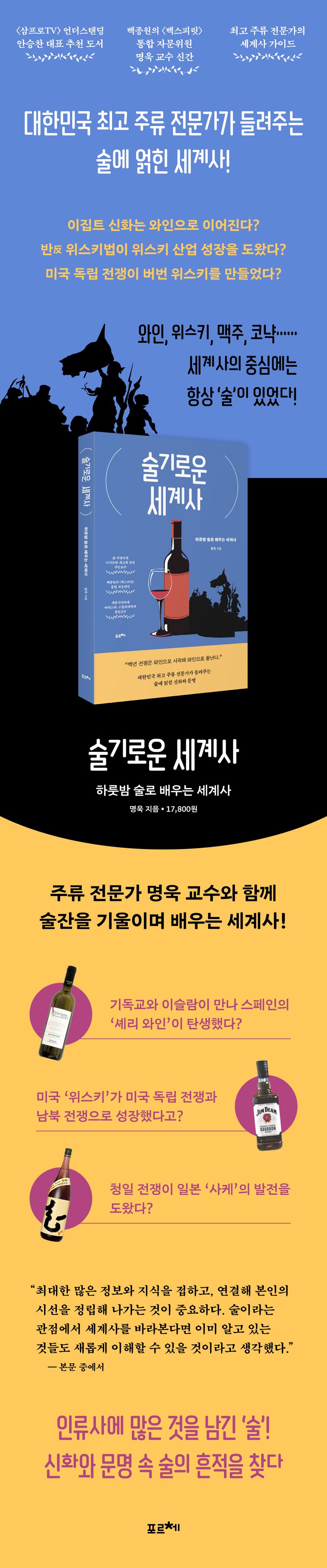 저자 명욱 교수는 대한민국 최고의 주류 인문학 전문가이자, 주류 칼럼니스트이다. 저자는 백종원의 〈백스피릿〉 통합 자문을 비롯한 주류 방송·강의 경력을 지니고 있다. 《술기로운 세계사》는 명욱 교수가 그간 모아온 술과 관련된 흥미로운 이야기, 술에 얽힌 세계사를 정리한 책이다. 주류 관련 역사와 신화·문화·전쟁·산업까지 아우르는 이 책은 술이 발명되면서 생긴 역사적 사건들을 알려 준다. 주종별로 술이 어떻게 만들어졌는지, 술의 탄생으로 역사의 흐름이 어떻게 바뀌었는지를 설명한다. 세계사가 어려운 독자를 위해 술과 관련된 재미있는 일화까지 담았다. 술은 인류와 역사를 잇는 다리이며, 생각보다 많은 사건과 밀접하게 연결되어 있다. 이 책으로 독자들은 역사를 바라보는 새로운 관점을 함께 공유하고, 나눌 수 있을 것이다. 술에 얽힌 역사나 신화에 관심 있는 사람, 세계사에 관심은 있었으나 어려워 보여서 쉽게 도전하지 못했던 독자들에게 유익할 책이다.