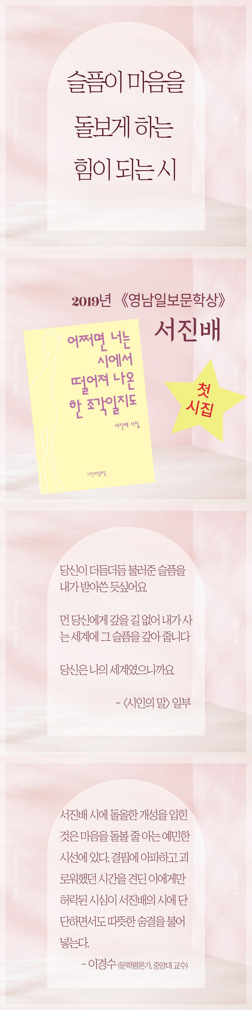 2019년 《영남일보문학상》으로 등단한 서진배 시인의 첫 시집이 시인의일요일에서 출간되었다. 지천명의 쉰 살에 첫 시집을 내는 일이 요즘은 그리 놀라운 일이 아니지만, 늦깎이 시인으로서 오랜 세월 시에 바친 그의 순정과 삶의 열정은 눈여겨볼 만하다.