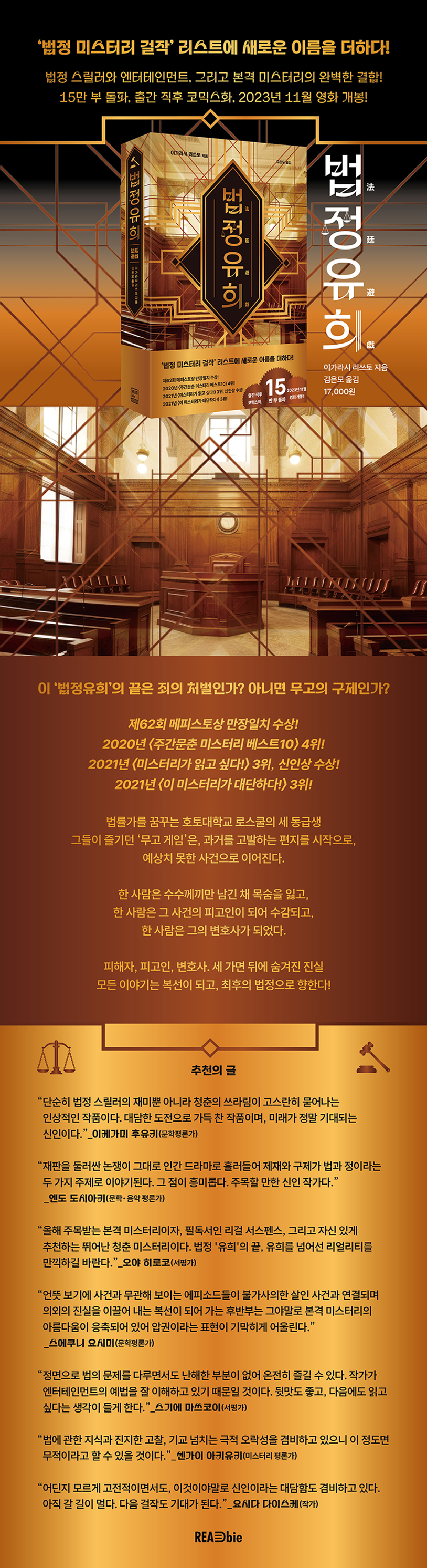 현직 변호사인 이가라시 리쓰토의 ‘경이로운 데뷔작’, 누적 15만 부를 돌파한 《법정유희》가 드디어 한국에 출간된다. 《법정유희》는 만장일치로 제62회 메피스토상을 수상했으며, 〈미스터리가 읽고 싶다!〉 3위와 신인상, 2020년 〈주간문춘 미스터리 베스트10〉 4위, 〈이 미스터리가 대단하다!〉 3위에 랭크되는 등 데뷔작으로는 믿을 수 없는 성과를 거뒀다. 또 그 어떤 작품보다 빠른 미디어믹스가 결정돼, 출간 즉시 코믹스와 영화로 만들어졌다.