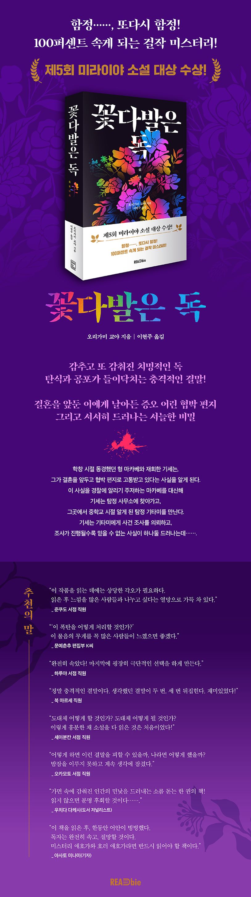 서늘한 여운과 충격적인 결말로 독자들의 극찬을 받은 오리가미 교야의 《꽃다발은 독》(2021)이 드디어 한국에 출간된다. 《꽃다발은 독》은 장르를 넘나드는 스토리텔러 오리가미 교야가 미스터리 장르에 처음으로 진지하게 도전한 작품으로, 출간 직후 인기 시사 TV 프로그램 〈왕의 브런치〉에 소개돼 큰 화제가 됐다. 2021년에는 제5회 미라이야 소설 대상을 수상했고, 2024년 문고본으로 출간돼 순위를 역주행하며 다시 한번 베스트셀러에 올랐다.
