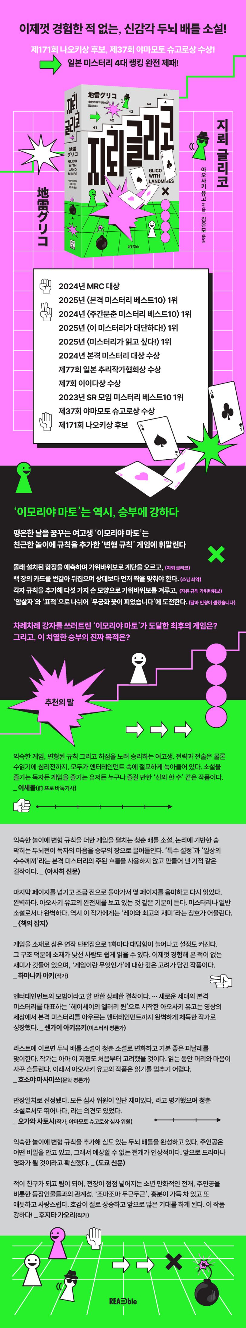 도립 호지로 고등학교 1학년, 유난히 승부에 강한 이모리야 마토는 본의 아니게 여러 게임에 휘말린다. 게임 종목은 가위바위보로 계단을 먼저 오르고, 카드를 뒤집어 짝을 맞추고, ‘무궁화 꽃이 피었습니다’로 겨루는 것처럼 익숙한 놀이들이지만, 모두 변형된 규칙이 적용돼 있다. 교묘한 속임수와 치밀한 논리, 그야말로 궁극의 심리전이 흥미진진하게 펼쳐지지만, 《지뢰 글리코》는 탁월한 엔터테인먼트이자 빼어난 청춘 소설이기도 하다.