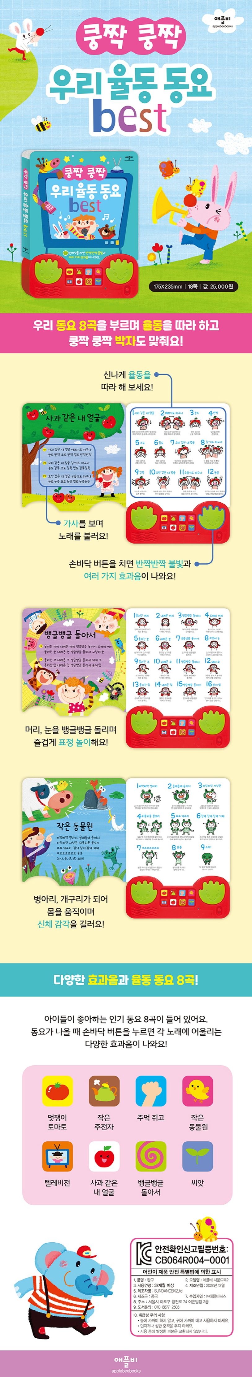 버튼을 눌러 8곡의 동요를 들으며 신나는 율동을 해 보는 율동 동요 사운드북입니다. 손바닥 모양의 리듬 버튼을 누르면 예쁜 불빛과 함께 각 노래에 어울리는 다양한 효과음이 나오지요. 또 각 페이지에는 노래에 어울리는 율동 동작이 자세하게 실려 있어서, 노래를 따라 부르며 신나게 춤을 출 수 있어요. 노래를 따라 부르며 즐겁게 춤을 추고, 손바닥 버튼을 눌러 다양한 소리로 박자도 맞추어 보세요.