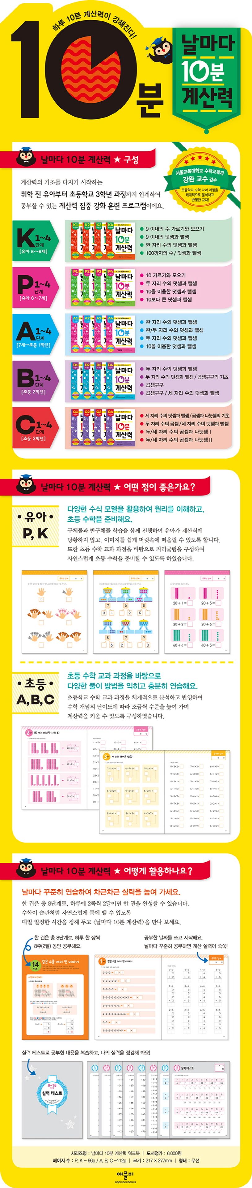 ● 계산의 개념을 익히기 시작하는 취학 전 아동부터(K단계, P단계) 반복적인 계산 훈련이 집중적으로 필요한 초등학교 1~3학년까지(A단계, B단계, C단계) 모두 5단계로, 각 단계별 4권씩 총 20권으로 구성되어 있어요.