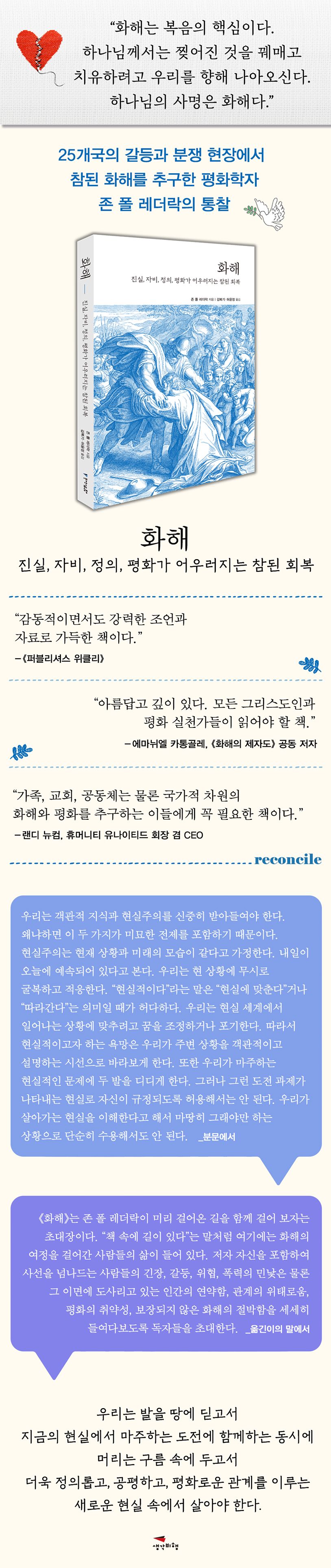 전쟁과 갈등으로 신음하는 지구촌 곳곳에서 평화를 추구하기란 쉽지 않다. 민족국가의 분열에서부터 종교 갈등에 이르기까지 모든 것이 산산이 부서지는 경험은 내면의 평화를 좀먹는 일이기도 하다. 지극히 어렵고, 고통스럽고, 종종 폭력적이기까지 한 상황에서 중재자 역할을 하면서 레더락은 ‘화해’야말로 평화의 궁극적 종착지라는 사실을 깨달았다.