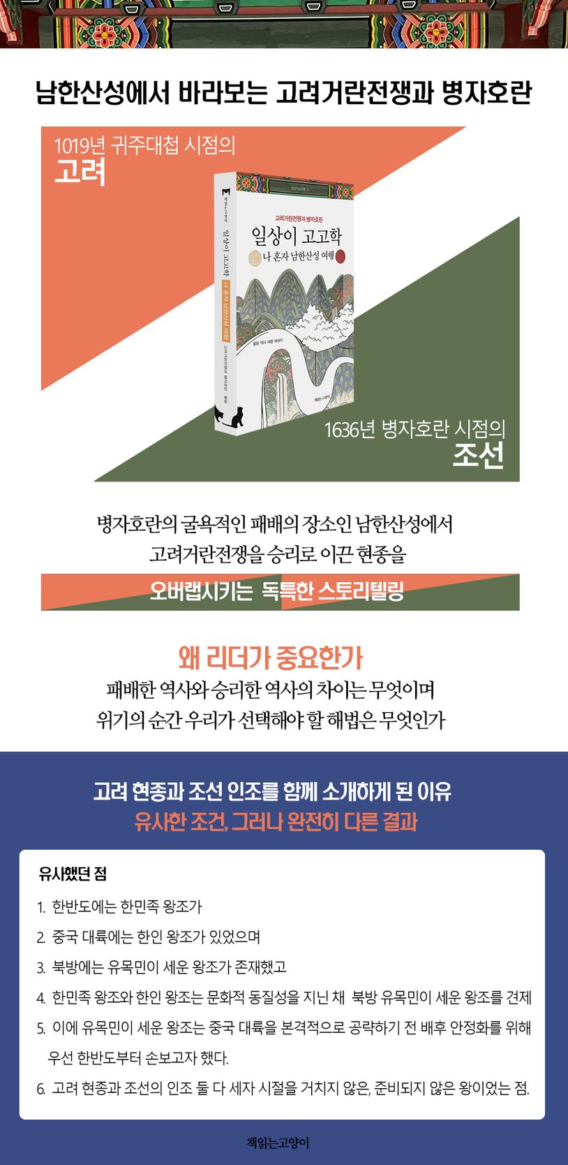 최근 병자호란을 배경으로 한 드라마 ‘연인’을 통해 남한산성에 대한 관심이 높다. 여기에 KBS 50주년 특별기획 대하사극 ‘고려거란전쟁’ 방송도 앞두고 있어 드라마를 통한 역사 읽기가 계속될 것으로 보인다. 때마침 이 책은 병자호란과 고려거란전쟁을 동시에 만날 수 있을 뿐만 아니라 고려와 조선, 현종과 인조를 비교 분석하는 색다른 시도와 여행이라는 형식을 통해 멀게만 느껴졌던 역사가 일상이 될 수 있도록 초대한다.