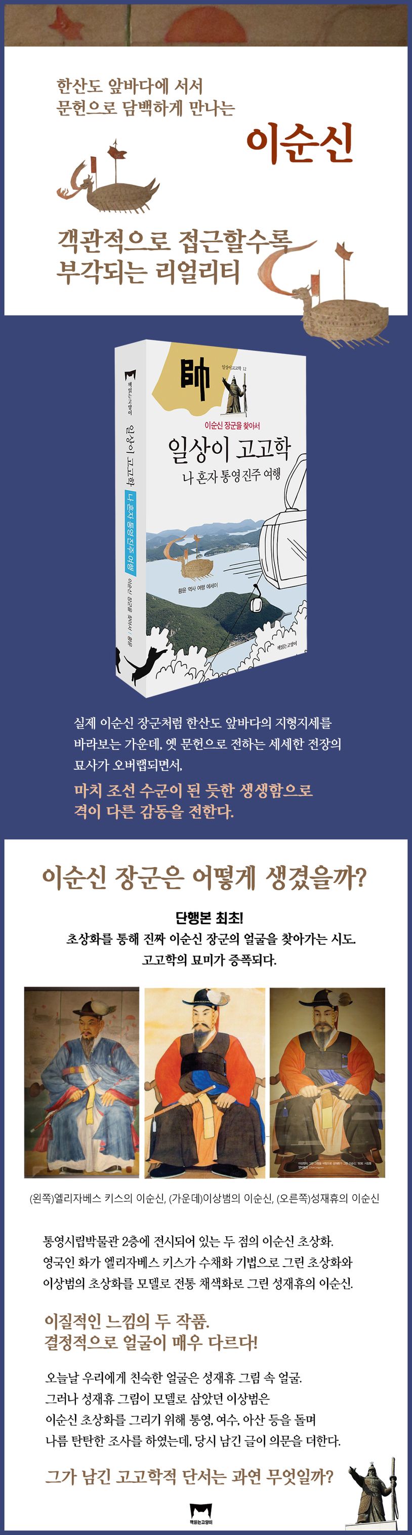 《일상이 고고학 : 나 혼자 통영 진주 여행》은 임진왜란의 최선전이었던 한산도를 직접 찾아가 이순신 장군의 면모를 밝히는 역사 탐방기로, 문헌을 통한 객관적인 고증 속에 점차 부각되는 리얼리티의 경험을 선사한다. 실제 이순신 장군처럼 한산도 앞바다의 지형지세를 바라보는 가운데 옛 문헌으로 전하는 세세한 전장의 묘사가 오버랩되면서, 마치 조선 수군이 된 듯한 생생함은 격이 다른 감동을 전한다.