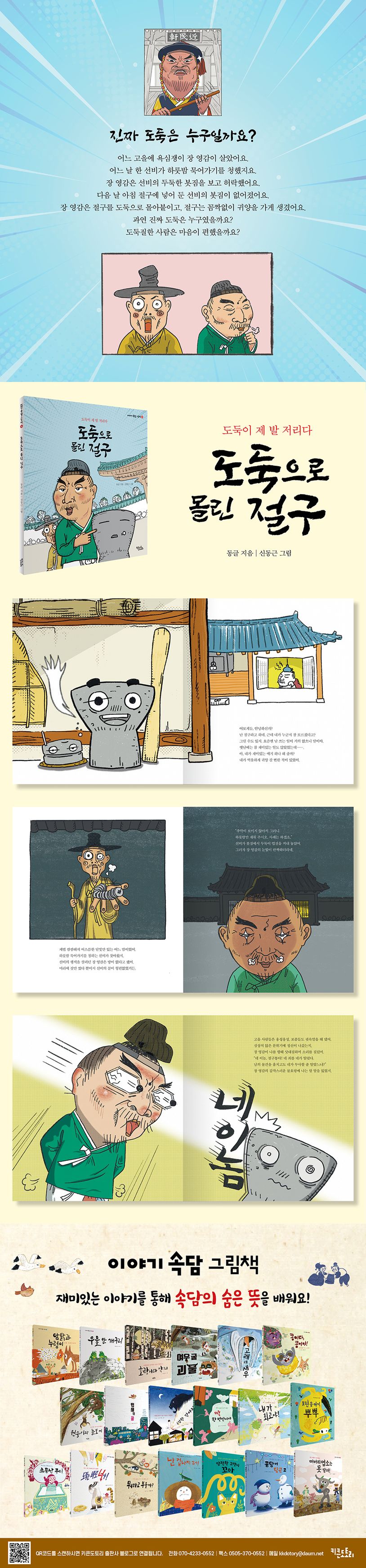 ■욕심부리다가모든것을잃은장영감옛날어느마을에장영감이라는부자가살았어요.장영감은욕심이많아서가난한이웃이아이가굶어죽는다고사정을해도쌀한톨빌려주지않았어요.그러던어느날,어두워지는저녁무렵에한선비가재워달라고찾아왔어요.장영감은선비의볼품없는행색을보고는거절했지요.하지만선비가봇짐에서두둑이엽전을꺼내자곧바로재워주겠다고했어요.방을얻은선비는흙이묻은봇짐을어디에둘까하다가마당에있는절구안에넣어두었어요.그런데그다음날아침,절구안에넣어둔봇짐이감쪽같이사라져버렸어요.봇짐을잃어버린선비는그길로관아로달려갔고,사또는장영감과절구를잡아왔어요.장영감은사또앞에서자기는결코봇짐을훔치지않았다고하면서,절구를도둑으로몰아붙였어요.사정을듣고있던사또는장영감의말이맞는것같다고하면서,봇짐을훔친절구를제주도로귀양보낸다는판결을내렸어요.하지만절구가혼자갈수없으니주인인장영감의등에져서보낸다고했지요.판결을들은장영감은무릎을꿇고엎드려자기가봇짐을훔쳤다고자백하면서살려달라고애원했어요.선비는장영감이곳간에가득찬곡식을마을사람들에게나눠주면용서하겠다고하고,장영감은할수없이이에따랐어요.그렇게해서곳간의곡식은마을사람들이나눠갖게되었고,절구는오랜만에솜씨를발휘해서곡식을빻았답니다.‘도둑이제발저리다’는속담은죄를지은사람이자기죄가탄로날까두려워하다가,자기도모르게스스로잘못을드러내게된다는의미로사용해요.잘못을저지르게되면누가뭐라고하지않아도잘못을들킬까봐마음이조마조마하고불안하거든요.그래서얼굴이벌게지거나손을떨기도하지요.마치장영감이불안한마음에식은땀을흘리고손을떨다가,엉뚱하게도절구에게죄를뒤집어씌운것처럼말이에요.이처럼잘못을저지르고이를들킬까봐안절부절못하는사람을보고‘도둑이제발저리다’라는속담을쓰는거랍니다.■흥미로운이야기로속담을배우는‘이야기속담그림책’시리즈속담은교훈적인내용을담아예로부터전해내려오는짧은글입니다.뜻을비유적으로표현했기때문에글만봐서는그의미를바로알기어렵습니다.우리아이들이속담의의미를제대로알게하려면어떻게해야좋을까요?바로속담에딱어울리는이야기를들려주는것입니다.‘도둑이제발저리다’는속담은죄를지은사람이자기죄가탄로날까두려워하다가,자기도모르게잘못을드러내게된다는의미입니다.하지만단순하게그의미를알려주는것으로는부족합니다.그보다는속담이녹아든흥미로운이야기를통해서속담의숨은의미를알려주고,쉽고자연스럽게그뜻을알게하는것이더좋은방법입니다.‘이야기속담그림책’시리즈는유쾌하고따뜻한속담속이야기를들려주기도하고,기존의속담을넘어선기발한상상력을보여주기도합니다.어른들이생각하기에뻔해보이는속담이야기가이시리즈를통해,무궁무진한상상의날개를타고새롭게탄생합니다.