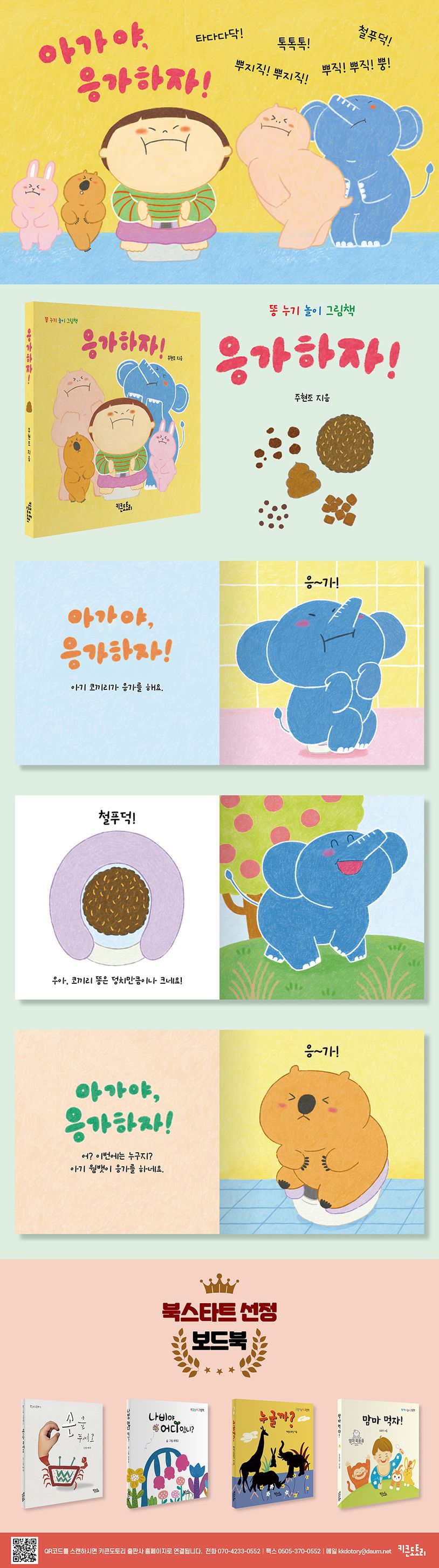 아기 동물들이 변기에 앉아 “응~가!” 하며 힘을 주어요. 아기 토끼는 동글동글 콩처럼 생긴 똥을 누고, 아기 코끼리는 큰 몸집만큼 거대한 똥을 누어요. 아기 웜뱃은 주사위처럼 네모반듯한 똥을 누고, 아기 하마는 꼬리를 흔들며 여기저기 똥을 흩뿌리지요. 이번에는 우리 아기 차례예요. 아기는 어떤 응가를 할까요?