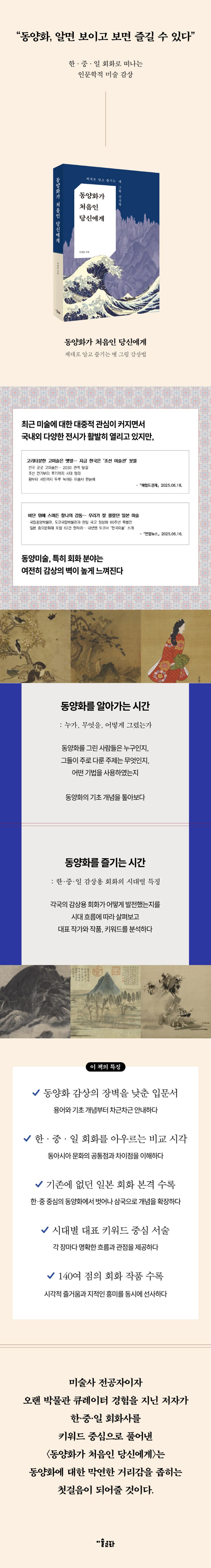 『동양화가 처음인 당신에게』는 한·중·일 회화의 흐름과 개념을 입문자의 눈높이에서 설명하는 친절한 안내서다. 미술사를 전공하고 박물관 큐레이터로 젊은 날의 대부분을 보낸 저자는 독자를 위한 작은 전시를 기획하고 책 안에 멋지게 펼쳐냈다. 이곳에 초대된 독자들은 저자의 안내를 받아 동양화의 기본 개념부터 대표 작가와 작품, 시대별 키워드까지 자연스럽게 익힐 수 있을 것이다.