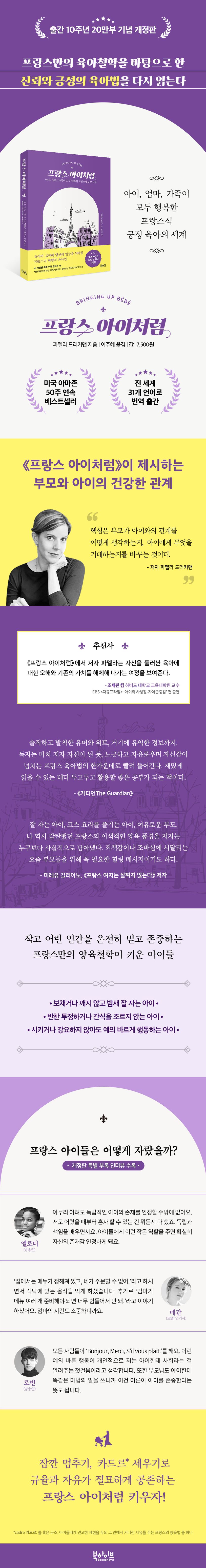 10주년을 맞아 출간된 개정판에는 프랑스 출신 로빈, 메간, 엘로디 세 사람의 인터뷰가 부록으로 실려 있어, 프랑스 가정의 카드르, 예절과 식사 교육의 실제를 생생하게 접할 수 있으며, 최근 세계적으로 이슈가 되고 있는 ‘셰어런팅’에 대한 세 사람의 생각과 경험도 함께 들어볼 수 있다.