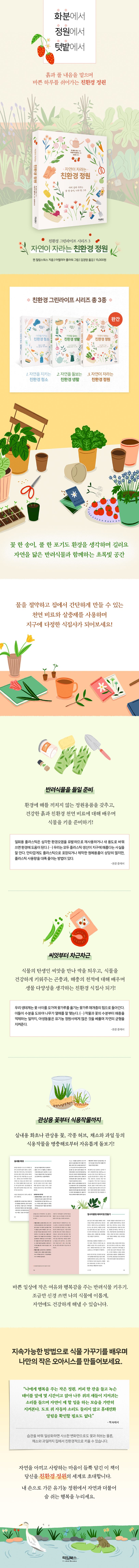 토양의 종류를 알아보는 법부터 자연과 일상의 재료로 비료 만드는 방법, 주방 창턱에 놓을 만한 화분이나 집 앞뜰에 계절에 맞는 식물을 심고 친환경적으로 병충해를 막는 방법까지…. ‘친환경 그린라이프 시리즈’의 《자연이 자라는 친환경 정원》은 누구나 한 번쯤 꿈꾸었던 ‘나만의 유기농 정원’을 가꿀 수 있도록, 지금 당장 실천할 수 있는 다양한 노하우를 소개합니다. 건강한 흙에다가 조그만 허브를 심어, 물을 절약하고 음식물 쓰레기를 줄이는 방식으로 키워볼 수도 있고, 운 좋게 작은 정원이나 텃밭이 있다면 본격 ‘유기농’ 정원을 가꿔볼 수도 있어요. 곤충과 새, 퇴비를 만드는 미생물이 친환경 정원사인 당신을 도와줄 거예요!