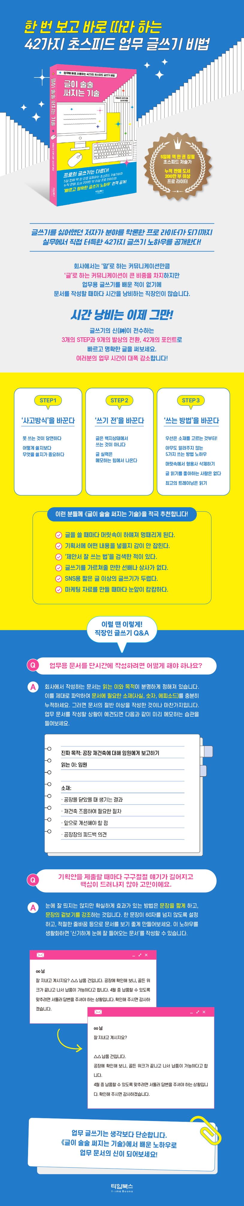 이러한 저자가 업무 글쓰기를 어려워하는 사람들을 위해 단순하면서도 진리에 가까운 핵심 노하우를 공개한다. STEP1에서는 글쓰기에 대한 고정관념을 바꿔주며 STEP2에서는 목적에 맞는 글을 빠르게 쓰려면 어떤 준비를 해야 하는지 알려준다. 마지막 STEP3에서는 구체적인 사례와 함께 바로 활용할 수 있는 글쓰기 노하우를 제시한다. 글을 쓰려고만 하면 손이 굳어버리는 사람들에게 《글이 술술 써지는 기술》은 유용한 해결서가 될 것이다.