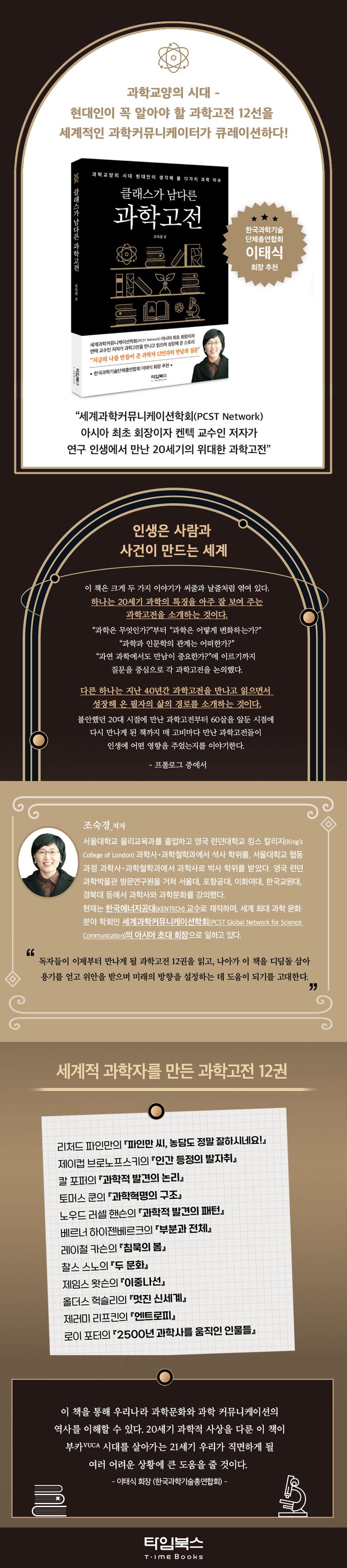 이러한 과학의 시대에 부응하기 위해 이 책은 현재 켄텍(한국에너지공과대학) 교수이자 세계과학커뮤니케이션학회의 회장인 조숙경 저자가 그동안 다양한 과학 커리어를 쌓아오면서 지금의 세계적 과학커뮤니케이터가 되기까지 영향을 준 대표적인 과학고전들을 소개하고 있다. 과학이 발전하면서 당대에 어떤 화두를 던져주었고 이것이 개인에게 영향을 미쳐 한 사람의 일생을 어떻게 변화시키고 진화시켰는지를 따라가다 보면 어느새 현대 과학고전들의 정수를 한 권으로 톺아보게 될 것이다.