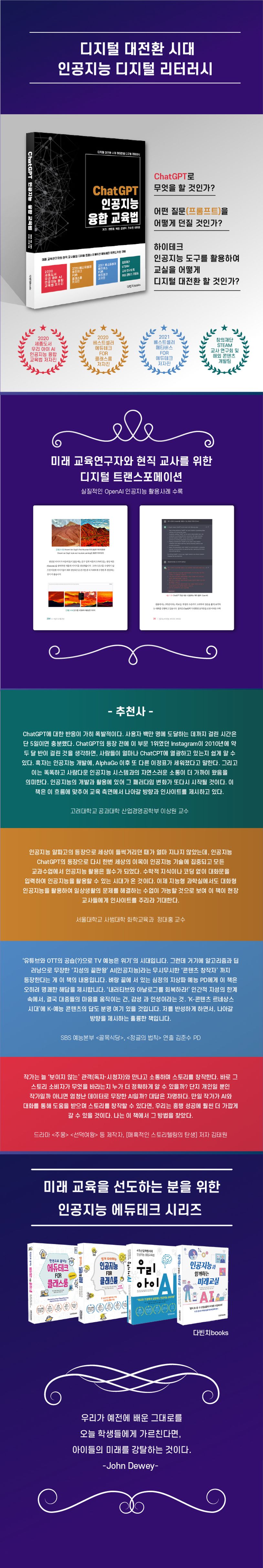 이제 우리는 ‘ChatGPT로 무엇을 할 것인가?’, ‘어떤 질문을 던질 것인가?’를 고민하면 됩니다. 이제 개인의 창의적 문제 발견력과 해결력을 충분히 발휘하도록 지원하는 교육혁신이 매우 시급한 상황이 되었습니다. 본 책은 ChatGPT가 가세한 디지털 대전환 시대 앞서가는 교육연구자와 현직 교사가 ChatGPT를 사용할 수 있도록 연계된 교육이론과 활용법을 압축하여 소개했습니다. 이번 ChatGPT의 등장이 인간이 가진 지적인 호기심, 상상력과 잠재력이 발휘되는 교육혁신의 서막이 열린 시기, 항상 교육을 위해 연구하시는 연구자들, 선생님들께 이 책이 도움이 되기를 진심으로 바랍니다.