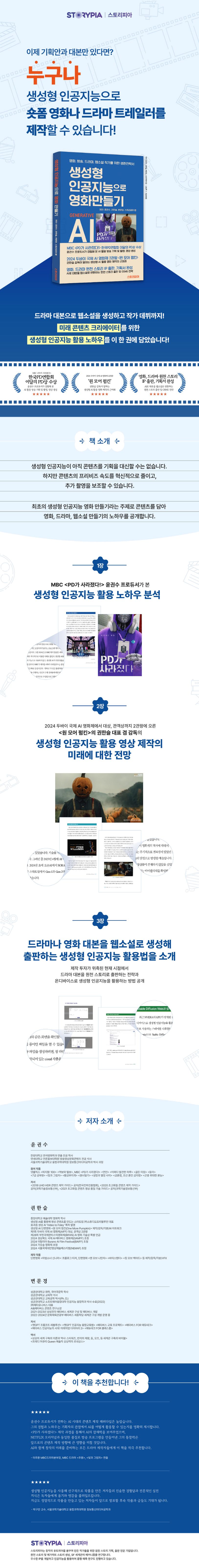 생성형 인공지능이 아직 콘텐츠를 기획하고 전반을 대신할 수는 없다. 하지만 콘텐츠를 기획하고 프리비즈 하는 속도를 혁신적으로 줄이고, 추가 촬영을 줄일 수 있다는 사실에 많은 콘텐츠 제작사들이 관심을 가지고 있다. 이러한 관심에 힘입어, 본 책에는 최초의 생성형 인공지능 영화 만들기라는 주제의 콘텐츠를 담아 모든 노하우를 공개한다.
