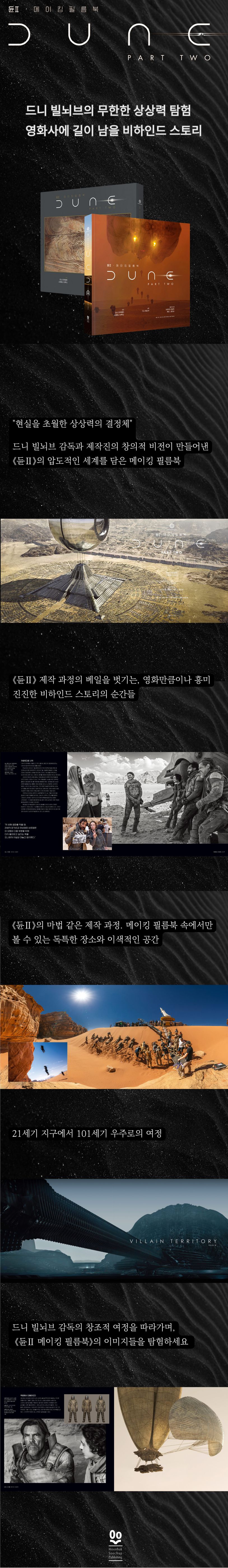 〈듄〉은 개봉 이후 전 세계에서 흥행이 거듭될수록, 후속작에 대한 관심이 증폭되었다. 많은 기대와 주목을 받으며 2022년 첫 촬영을 시작하고 2023년 《듄: 2부》의 영화화 작업이 완료되었다. 《듄Ⅱ: 메이킹 필름북》은 이 영화가 감독의 머리에서 구상되고, 제작진과 출연진이 합심하여 현실적 제약을 뛰어넘어 기념비적인 SF 영화로 만들어졌는지, 그 치열한 제작 과정과 생생한 현장을 담은 책이다.