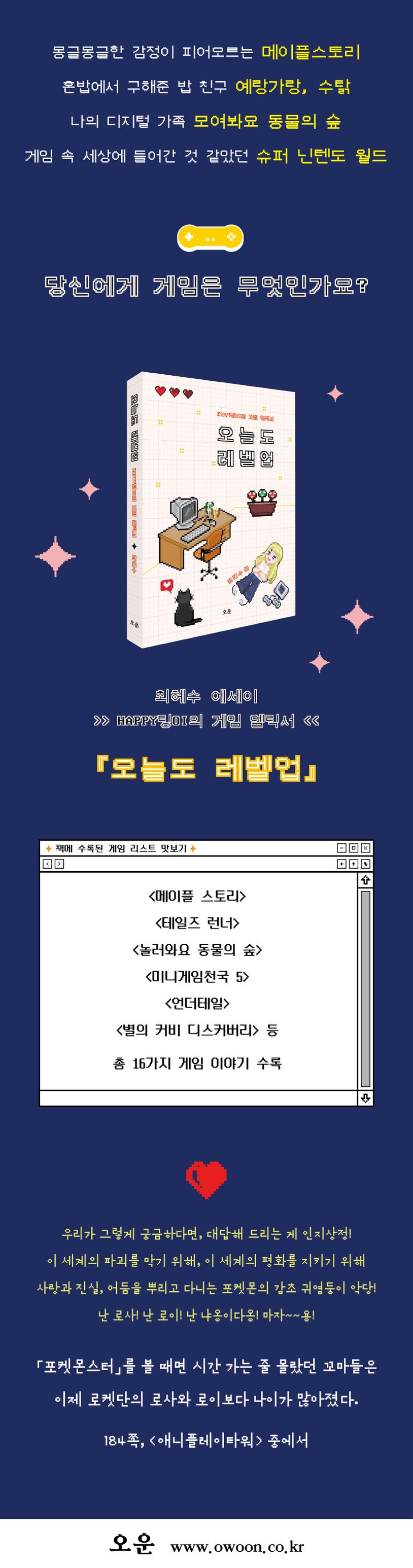 《오늘도 레벨업》은 공포, 퍼즐, 캐주얼 등 장르를 가리지 않고 모바일부터 컴퓨터, 콘솔 게임까지 두루 즐겨온 넥슨 MZ 직장인의 감정과 기억을 담은 에세이입니다. 오래된 도트 그래픽, 서버 종료 공지, 여전히 잊히지 않는 배경음악. 저자는 지난 시간을 함께 건너온 게임들을 통해 성장기의 시절을 되짚어 나가며, 게임이라는 하나의 세계가 한 사람의 감정과 관계를 어떻게 품고 있었는지 섬세하게 조명합니다.