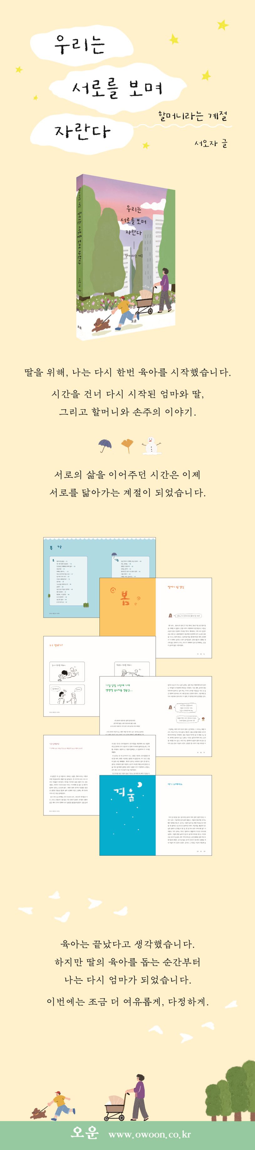 책은 '봄, 여름, 가을, 겨울' 네 계절의 흐름에 따라 구성되었다. 손주가 태어난 봄부터 최근의 겨울까지, 각각의 계절은 육아의 국면이자 인생의 은유로 독자에게 다가간다. 계절의 흐름 속에서 변화하는 가족의 표정과 할머니라는 역할에 담긴 따뜻한 연민이 진하게 녹아 있다.