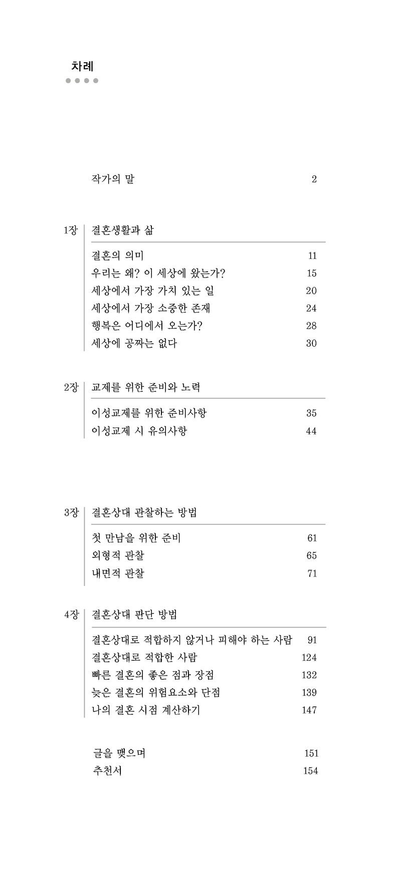 작가의말 21장결혼생활과삶결혼의의미 11우리는왜?이세상에왔는가? 15세상에서가장가치있는일 20세상에서가장소중한존재 24행복은어디에서오는가? 28세상에공짜는없다 302장교제를위한준비와노력이성교제를위한준비사항 35이성교제시유의사항 443장결혼상대관찰하는방법첫만남을위한준비 61외형적관찰 65내면적관찰 714장결혼상대판단방법결혼상대로적합하지않거나피해야하는사람 91결혼상대로적합한사람 124빠른결혼의좋은점과장점 132늦은결혼의위험요소와단점 139나의결혼시점계산하기 147글을맺으며 151추천서 154