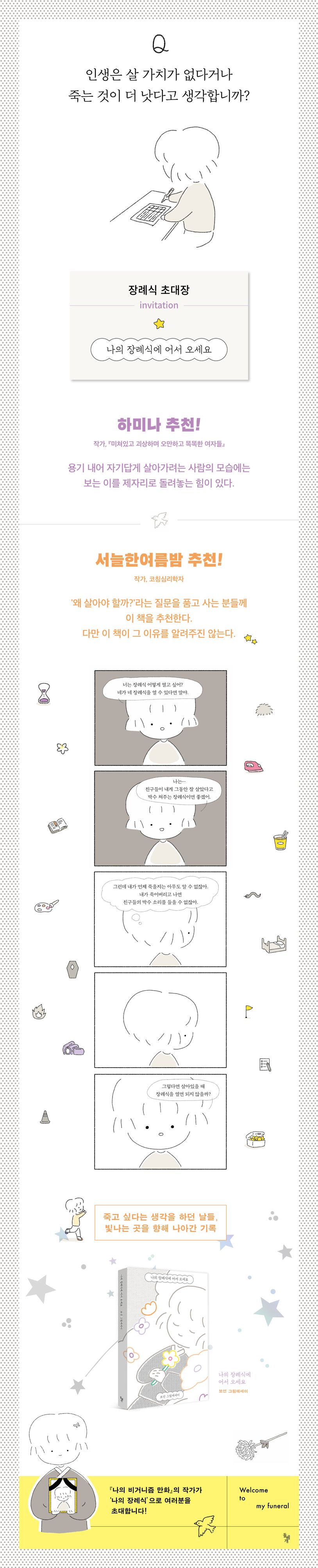 『나의 비거니즘 만화』로 2만이 넘는 독자를 성공적으로 ‘비거니즘’veganism의 세계로 안내한 보선의 신작 그림에세이. 누구나 그렇듯, 작가인 보선도 인생의 어느 시점에 죽음에 대해 고민했다. 우울증을 앓기도 했던 탓일까, 그는 “태어난 이상 계속 살아야 한다는 사실이 버겁다”고 느꼈고, “나 자신이 뜬구름 같다”고 여기기도 했다. 그에게는 “삶과 죽음의 선택지 앞에서 계속 삶을 선택하고 있다”는 사실이 당연하지 않았기에, ‘살아야 할 이유는 무엇일까’라는 문제는 한동안 그를 사로잡았다. 2021년 4월 12일, 보선은 ‘장례식’을 올렸다. 초대받은 ‘하객’들은 기꺼이 보선의 유튜브 라이브 장례식에 참석해 ‘축하의 말’을 전했다. 보선은 이런 ‘별스러운 이별 의식’을 통해 무엇을 이루고 싶었을까? 그리고 무엇을 얻었을까? 『나의 장례식에 어서 오세요』에 그런 해답이 담겨 있을지는 확실하지 않지만, 보선은 단지 “나는 이렇게 살아냈답니다.” 하고 말하고 싶었다.