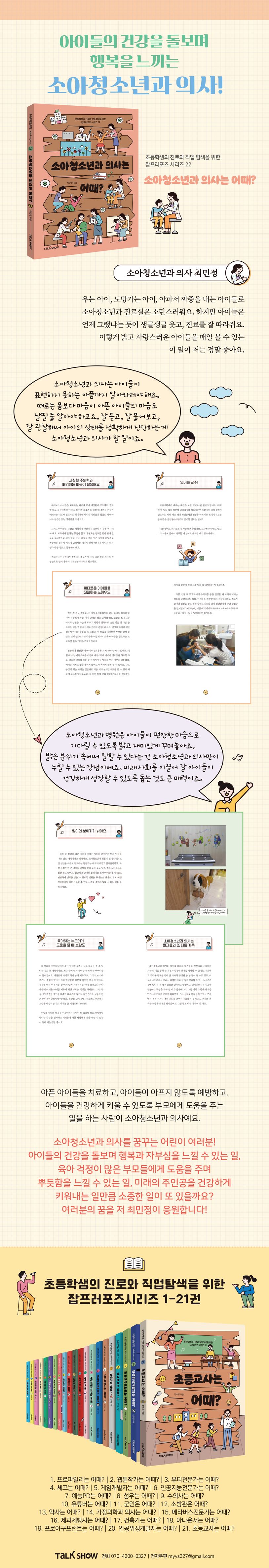 예방접종을 하고 우는 아이, 진찰이 무서워 도망가는 아이도 모두 예쁘다는 소아청소년과 의사 최민정. 밝고 사랑스러운 아이들과 함께 시간을 보내면 어느새 아이들의 활기찬 에너지가 전달되어 기분이 좋아진다고 해요. 무엇보다 심하게 아팠던 아이들이 건강을 회복해 퇴원하는 모습을 보면 의사로서 큰 보람을 느끼고요. 하지만 이 순간이 있기까지 오랜 시간 공부하고 수련하는 과정에서 어려움도 있었다고 해요. 이 책은 선배 의사로서 어떤 어려움이 있었고, 어떻게 극복했는지 솔직한 경험을 담았어요. 잘 알려지지 않은 소아청소년과 의사의 역할과 미래의 모습도 생생한 목소리로 들려줍니다.