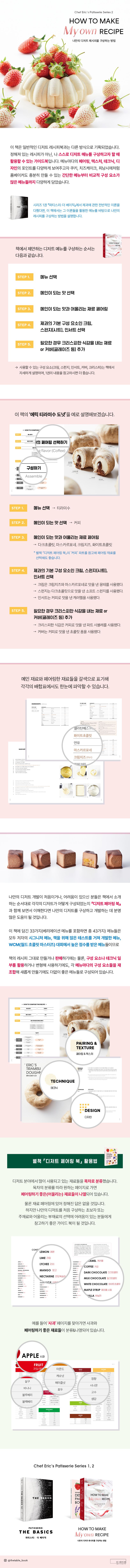 Chef Eric's Patisserie Series는 총 3권으로 구성되어 있으며 서로 연결되어 있습니다. 1권인 『파티스리: 더 베이직』은 제과에 관한 기본 이론과 원리를 담았고, 2권인 『나만의 디저트 레시피를 구상하는 방법』은 1권의 이론을 활용한 레시피를 제안하며 디저트 레시피를 스스로 구상하는 방법을 설명합니다. 1권이 없는 분들도 무리 없이 보실 수 있도록 공정을 표기하였으나, 과정 사진과 상세 설명이 담긴 1권과 함께 보시는 것을 추천합니다. (3권은 데커레이션에 관한 주제로, 2025년 상반기에 출간될 예정입니다.)