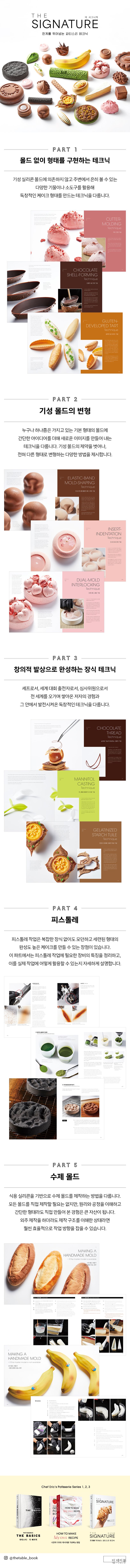 Chef Eric's Patisserie Series는 총 3권으로 구성되어 있다. 1권 『파티스리: 더 베이직』은 제과에 관한 기본 이론과 원리를 다루고, 2권 『나만의 디저트 레시피를 구상하는 방법』은 1권의 이론을 활용한 레시피를 제안하며 디저트 레시피를 스스로 구상하는 방법을 다룬다. 이 시리즈의 마지막인 『더 시그니처: 한계를 뛰어넘는 파티스리 테크닉』은 디저트의 형태를 구상하고 질감을 표현하며, 본인이 구상한 레시피와 표현하고자 하는 디자인이 하나로 완성될 수 있는 테크닉을 체계적으로 이해할 수 있도록 돕는다.
