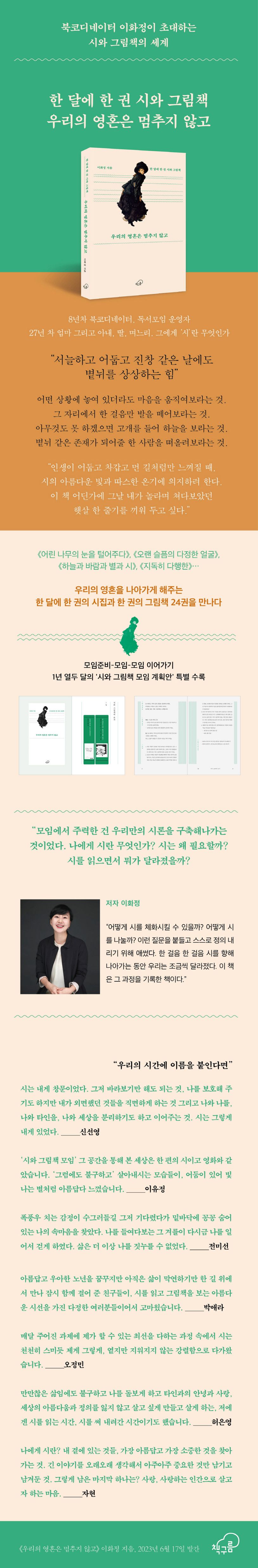 《우리의 영혼은 멈추지 않고》는 한 달에 한 권씩, 시집과 그림책 24권을 1년 동안 함께 읽은 독서 모임의 기록이자, 시와 그림책을 사랑하고 오랫동안 읽어온 저자가 독자를 위해 쓴 ‘시와 그림책 초대장’이다. 시와 그림책을 읽어온 이력에 관계없이, 혼자든 여럿이든, 각 장 앞머리에 있는 ‘모임 준비-본 모임-모임 이후 이어가기’로 구성된 계획안을 참고하며 저마다 다양하게 읽어갈 수 있을 것이다.