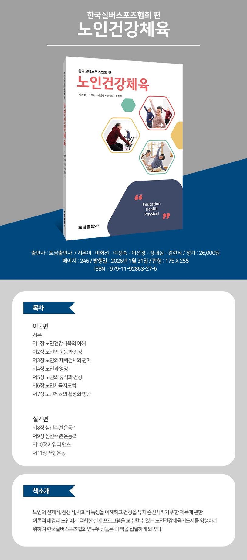 이론편서론제1장노인건강체육의이해제2장노인의운동과건강제3장노인의체력검사와평가제4장노인과영양제5장노인의휴식과건강제6장노인체육지도법제7장노인체육의활성화방안실기편제8장심신수련운동1제9장심신수련운동2제10장게임과댄스제11장저항운동