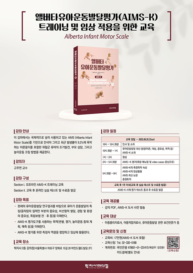 2023년 8월 20일에 학지사 2층 강의장(서울특별시 마포구 양화로 15길 20 마인드월드빌딩)에서 오프라인 AIMS-K 트레이닝 교육을 실시한다. 이 강좌에서는 유아기 운동발달의 특징과 AIMS-K 평가도구를 사용하는 목적을 이해하고 임상 활용의 방법에 대해 교육할 예정이다.