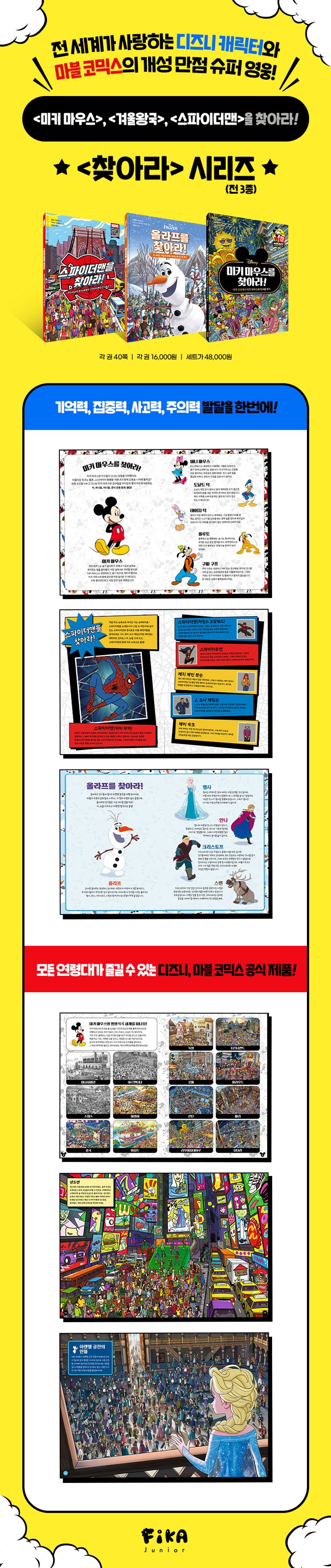 집중력을 쑥쑥 키워 주고, 상상력을 팡팡 터트리는 피카주니어 숨은그림찾기 책, ‘찾아라 시리즈’ 01~03권. 미키 마우스 탄생 90주년을 기념하는 특별판 《미키 마우스를 찾아라!: 세계 곳곳에서 미키 마우스와 친구들 찾기》, 월트 디즈니 컴퍼니 창립 90주년을 기념한 영화 〈겨울왕국〉과 후속작 〈겨울왕국2〉 속 주요 캐릭터와 장면을 담은 《올라프를 찾아라!: 눈 내리는 겨울왕국에서 올라프와 친구들 찾기》, 마블 코믹스 창립 80주년과 스파이더맨 탄생 60주년을 기념하는 특별판 《스파이더맨을 찾아라!: 아수라장이 된 뉴욕에서 스파이더맨과 친구들 찾기》로 구성했다. 어린이들에게는 집중력과 주의력, 사고력, 기억력을 키워 주고, 어른들에게는 잊고 있었던 동심과 추억을 자극하는 동시에 치매 예방까지 돕는다. 모든 연령대가 즐길 수 있는 감성 충만, 실용 만점, 종합선물세트 같은 숨은그림찾기 책이다.