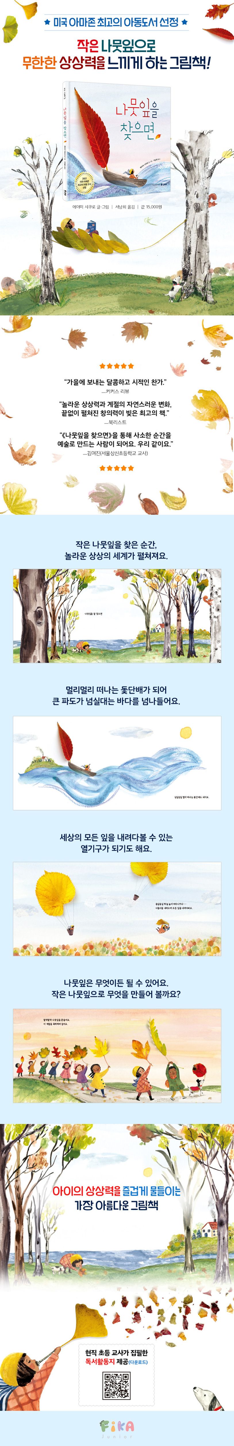 어린이들에게 무한한 상상력과 책 읽는 즐거움을 느끼게 하는 〈피카 그림책 시리즈〉 일곱 번째 작품 《나뭇잎을 찾으면》이 출간되었습니다. 《나뭇잎을 찾으면》은 작은 나뭇잎을 발견하면서 시작된 소녀의 특별한 하루를 단순하면서도 따뜻하게 담아낸 그림책입니다. “가을에 보내는 달콤하고 시적인 찬가”, “놀라운 상상력과 계절의 자연스러운 변화, 끝없이 펼쳐진 창의력이 빚은 최고의 책”이라 칭송받으며, 2022 미국 아마존 최고의 아동 도서로 선정되었습니다. 어린이들에게 무궁무진한 상상력과 꿈을 키워 주는 수작으로, 어린이들은 《나뭇잎을 찾으면》을 통해 우리 일상에서 쉽게 발견할 수 있는 작은 나뭇잎 하나로 지도에 없는 나만의 세상에서 자유롭게 뛰놀 수 있습니다. 앞뒤 면지에는 가을에만 볼 수 있는 나뭇잎들이 소개되어 있어 어린이들의 호기심을 자극합니다. 책의 맨 끝에는 나뭇잎을 오랫동안 보존할 방법과 나뭇잎으로 놀 수 있는 다양한 방법이 수록되어 있어, 나뭇잎만 줍는다면 누구나 나만의 세상을 꾸며 볼 수 있습니다. 글을 짓고 그림을 그린 에이미 시쿠로가 담아낸 독특한 기법의 그림과 감성적이고, 여운 있는 글은 어린이와 어른 모두에게 예술적 감각과 문학적 감성을 깨워 줍니다.