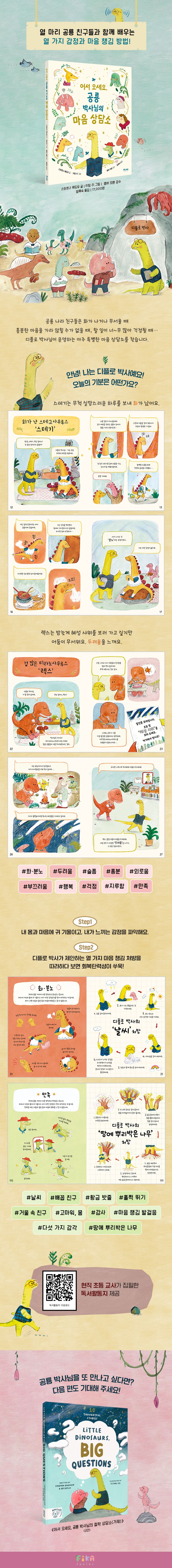 이책은모든감정을인정하고돌보는힘은스스로에게서나온다는것을일깨워준다.할머니가떠나서슬픔을느낄때,너무너무바빠서해야할일을제대로해내지못할때,매일보던내모습이갑자기못나보일때등공룡친구들이놓인상황과그속에서느끼는감정은어린이독자들이일상에서자주느끼는감정과도맞닿아있다.디플로박사님은울고싶은마음,화가나는순간,내가작아진것만같은기분등내가느끼는그어떤감정도틀리지않았음을다정하게이야기한다.그러면서긍정적인감정은강화하고,부정적인감정은회복해나가도록호흡법,긍정적시각화등의심리전략을구체적으로제시하며독자의곁에선다.이책은단순히올바른감정표현방법을가르쳐주는것을넘어,어린이의눈높이에맞춰정서적안정성과회복탄력성을길러줄것이다.