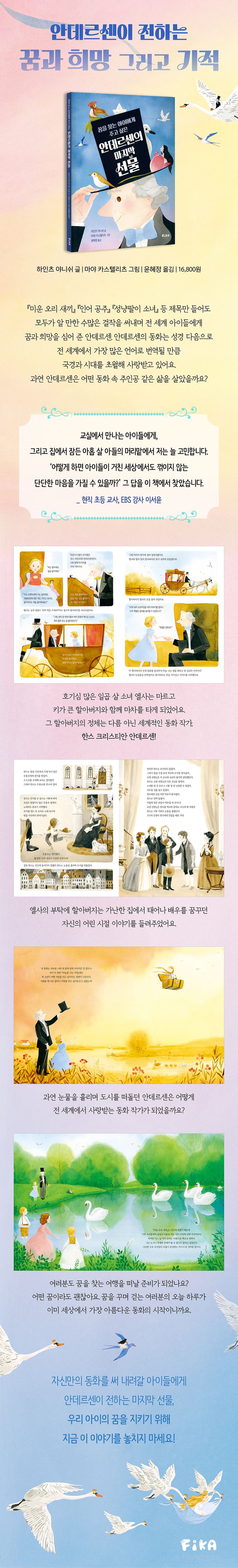 우리가몰랐던안데르센의어린시절우리는안데르센을화려한성공을거둔동화의아버지로기억해요.하지만안데르센의어린시절은동화처럼아름답지않았어요.사실안데르센의아름다운동화들은안데르센의춥고배고팠던어린시절에서비롯된것이랍니다.안데르센은구두수선공의아들로태어나아빠가일찍돌아가셨고가난때문에학교도제대로다니지못했어요.배우를꿈꾸었지만사람들에게비웃음을당하고목소리까지낮고거칠어지면서다른꿈을꾸어야했지요.이렇게힘든시절을보냈지만안데르센은포기하지않고글쓰기에서새로운기쁨을찾았어요.그리고동화의세계에자신의꿈과능력을아낌없이쏟아부어존경받는작가가되었지요.어린시절의고단하지만생생한삶이담긴안데르센의이야기는아이들에게어떤위인전보다더깊은공감과위로를불러일으키고스스로의가능성을믿게만드는선물이될거예요.꿈을찾는어린이들을위한특별한그림책열네살의어린나이에배우라는꿈을이루기위해혼자큰도시로떠난안데르센의도전은어쩌면무모해보일지도몰라요.“정신이이상한모양이야!”라며사람들에게차가운무시와거절을당했을때는다시고향으로돌아가고싶었을거예요.하지만안데르센은멈추지않았어요.자신이할수있는새로운도전에용감하게발을디뎠지요.안데르센의도전과성공은실패앞에서어떻게다시일어서야하는지,그리고꿈을향한열정이어떻게새로운길을열어주는지보여줍니다.수많은실패에좌절할아이들에게포기하지않는다면누구나자신만의특별한왕국을찾을수있다는강력한희망의메시지를전하지요.여러분도꿈을찾는여행을떠날준비가되었나요?어떤꿈이라도괜찮아요.꿈을꾸며걷는여러분의오늘하루가이미세상에서가장아름다운동화의시작이니까요!안데르센의동화속에숨겨진비밀안데르센의아름다운동화속에는사실안데르센이겪은삶의조각들이비밀스럽게숨겨져있어요.안데르센은자신이겪은불행과외로움,그리고예민했던실제성격까지동화속에녹여냈답니다.고통스러운현실을외면하는대신상상력을동원해환상적인이야기로바꾼것이지요.안데르센의어린시절을알고나면우리가잘안다고생각했던익숙한동화들이아주새롭게보이기시작해요.『미운오리새끼』는가난한구두수선공의아들이었던안데르센이존경받는작가가된것처럼누구나특별한존재가될수있다고말하는이야기로,『엄지공주』는제비처럼자유롭게행복을찾아떠나고싶어했던안데르센의간절한소망이담긴이야기로만날수있지요.이처럼동화뒤에숨겨진안데르센의진짜이야기를만나는순간,아이들은이전과는전혀다른깊이로동화를읽게될거예요.어린시절의슬픔을위대한문학작품으로승화시킨안데르센을통해이제동화책너머에숨겨진더큰세상으로의여행을시작해보세요.환상과현실을넘나드는마법같은이야기2024년안데르센상수상자인하인츠야니쉬가안데르센의어린시절을따뜻하고깊이있게그려냈어요.안데르센이직접이야기를들려주는방식을통해독자들은마치마차옆자리에앉아안데르센의이야기를듣는듯한몰입감을느끼게될거예요.여기에마야카스텔리츠의환상적인그림이더해져안데르센이말한‘인생자체가가장아름다운동화’라는철학을아름답게표현했습니다.마야카스텔리츠는안데르센의현실세계는차분한세피아톤으로,안데르센이꿈꾸는동화의세계는화려하고다채로운색채로대비시켜꿈이얼마나삶을찬란하게하는지보여주고있어요.특히마지막장면에서마차가하늘을날아오르는환상적인그림은독자들에게잊지못할마법같은여운을남길거예요.자,이제안데르센처럼나만의꿈을찾으러떠나봐요!줄거리코펜하겐으로향하는덜컹거리는마차안,호기심많은일곱살소녀엘사는앞에앉은마르고키가큰할아버지에게물었어요.“할아버지는나이가많아요?”할아버지는빙그레웃으며대답했어요.“나는한때소년이었고여전히그소년은내안에살아있단다.하지만네앞에앉아있는모습만큼나이가많기도하지.”그할아버지의정체는다름아닌세계적인동화작가,한스크리스티안안데르센이었어요.엘사가할아버지에게동화를들려달라고하자할아버지는자신의어린시절이야기를시작합니다.가난한집에서태어났지만저녁이면동화를읽어주던아빠와의추억부터배우라는꿈을이루기위해작은보따리를들고무작정큰도시로떠났던무모한도전까지.눈물을흘리며도시를떠돌던안데르센은어떻게전세계의마음을훔친동화작가가되었을까요?꿈을찾는아이들이자신만의아름다운동화를만들어갈수있도록용기와희망을건네는그림책입니다.*인증유형:공급자적합성확인