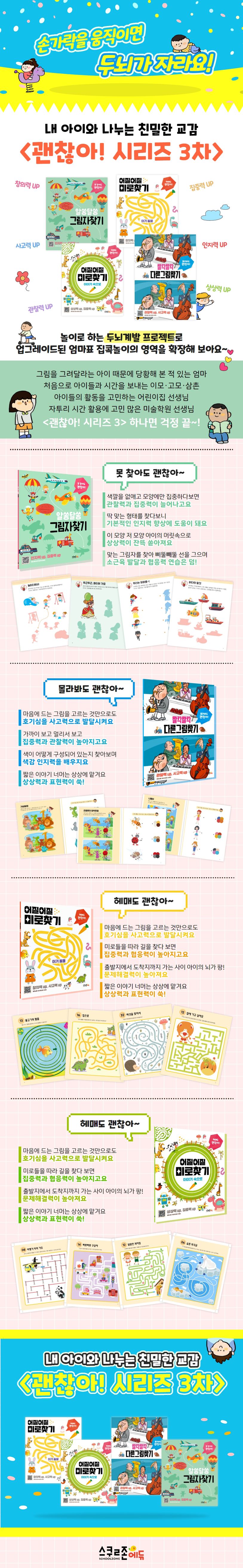 〈괜찮아! 시리즈〉는 놀이로 하는 두뇌계발 프로젝트입니다. 종이접기, 선긋기, 숨은그림찾기, 빠진그림찾기, 색칠하기, 그림자찾기, 다른그림찾기, 미로찾기 등으로 구성하여 유아기 아이들에게 꼭 필요한 소근육 발달, 관찰력 향상, 집중력 기르기, 상상력과 표현력을 확장하기 위해 기획되었습니다. 시리즈명처럼 서툴러도, 손재주가 없어도, 정확하지 않아도, 못 찾아도, 몰라봐도 다 괜찮은 놀이책입니다.