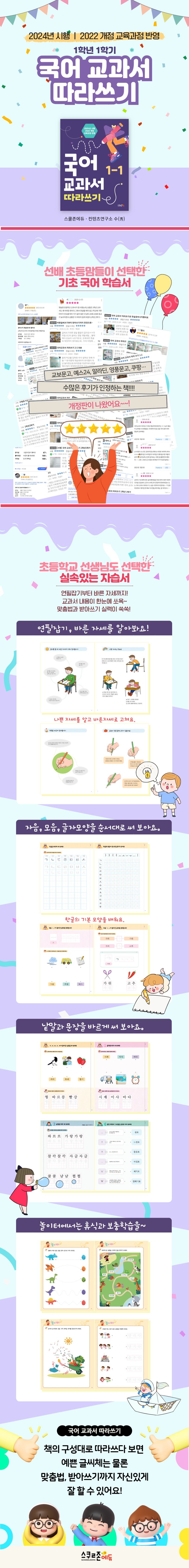 초등학교 저학년 때는 공부습관을 만드는 게 필요합니다. 먼저 엉덩이를 의자에 붙이고 바르게 앉는 법부터 배웁니다. 짧은 시간이어도 괜찮습니다. 집중해서 쓰고 읽고 생각하는 시간을 매일 일정하게 갖게 하세요. 특히 유아 때부터 스마트폰에 익숙하여 손힘이 약한 요즘 어린이들에겐 써보는 연습이 필요합니다. 쓰기 위해서는 책상 앞에 앉아야 하니 공부하는 습관도 길러지겠지요. 초등학교 저학년에서 쓰기를 연습하는 데 국어 교과서는 참 좋은 교재랍니다. 듣기, 말하기, 읽기, 쓰기, 문법, 작품감상까지 망라돼 있습니다. 얇은 교과서 안에 그 많은 게 다 들어가 있나 싶겠지만 영역별로 골고루 배울 수 있게 돼 있습니다. 해당 학년에서 꼭 알아야 할 성취 기준에 맞춰 집필되었으니까요. 이 책은 2024년부터 시행된 개정 교육과정에 따른 국어 1-1(가·나), 국어활동 교과서를 충분히 소화할 수 있게 만들었습니다. 먼저 큰 소리로 읽고 한 자 한 자 또박또박 쓸 수 있게 지도해 주세요. 손힘도 키우고, 글자도 익히고, 낱말도 배우고, 문장도 익혀 글을 읽는 재미를 한층 더 느끼게 해줍니다.