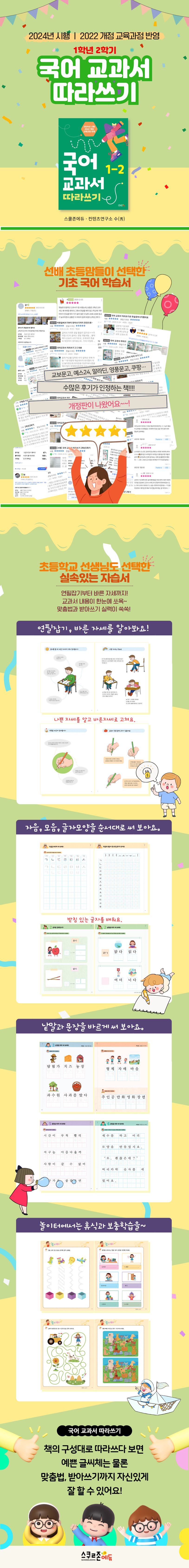 초등학교 저학년 때는 공부습관을 만드는 게 필요합니다. 먼저 엉덩이를 의자에 붙이고 바르게 앉는 법부터 배웁니다. 짧은 시간이어도 괜찮습니다. 집중해서 쓰고 읽고 생각하는 시간을 매일 일정하게 갖게 하세요. 특히 유아 때부터 스마트폰에 익숙하여 손힘이 약한 요즘 어린이들에겐 써보는 연습이 필요합니다. 쓰기 위해서는 책상 앞에 앉아야 하니 공부하는 습관도 길러지겠지요. 초등학교 저학년에서 쓰기를 연습하는 데 국어 교과서는 참 좋은 교재랍니다. 듣기, 말하기, 읽기, 쓰기, 문법, 작품감상까지 망라돼 있습니다. 얇은 교과서 안에 그 많은 게 다 들어가 있나 싶겠지만 영역별로 골고루 배울 수 있게 돼 있습니다. 해당 학년에서 꼭 알아야 할 성취 기준에 맞춰 집필되었으니까요. 이 책은 2024년부터 시행된 개정 교육과정에 따른 국어 1-2(가·나), 국어활동 교과서를 충분히 소화할 수 있게 만들었습니다. 먼저 큰 소리로 읽고 한 자 한 자 또박또박 쓸 수 있게 지도해 주세요. 손힘도 키우고, 글자도 익히고, 낱말도 배우고, 문장도 익혀 글을 읽는 재미를 한층 더 느끼게 해줍니다.