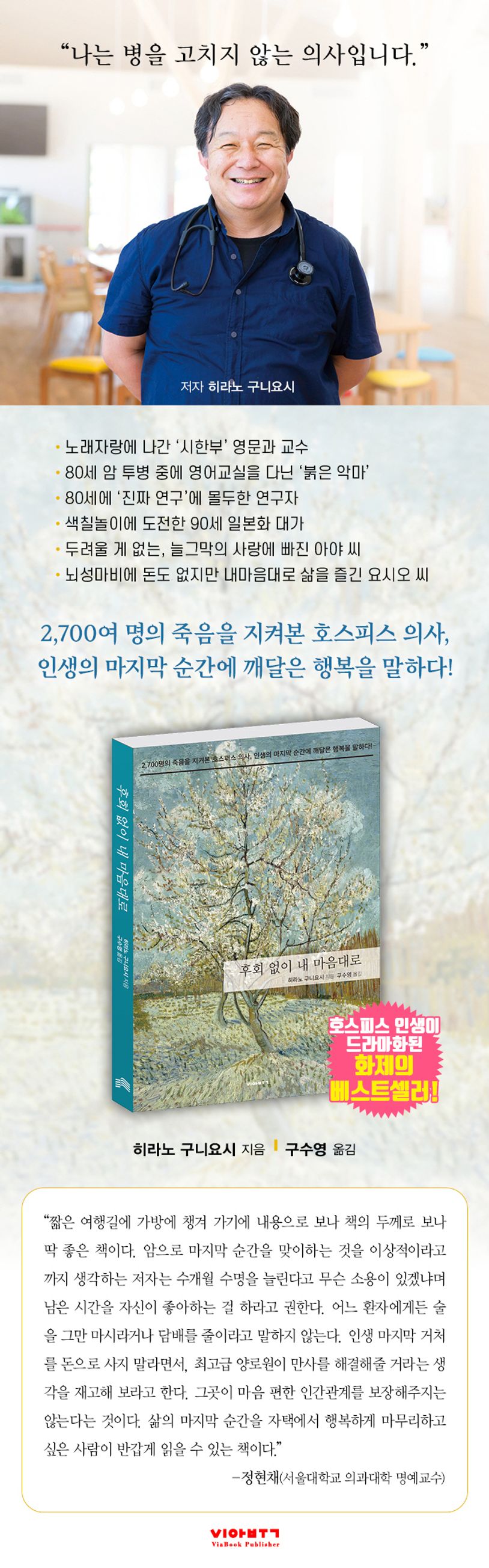 “나는 병을 고치지 않는 의사입니다.” 히라노 구니요시는 스스로를 이렇게 소개한다. 그의 직업은 ‘방문 진료 의사’, 다시 말해 호스피스 의사다. 자택 요양 중인 고령자, 말기 암 환자, 기타 질병으로 종말기를 맞이한 환자…… 즉, 인생에 남은 시간이 많지 않은 사람들의 곁을 지키고 돌본다. 2002년 방문 진료 특화 클리닉을 개업한 이래 2,700여 명의 마지막 순간을 지켜봐 오며, 행복한 마무리를 위해 필요한 것이 무엇인지에 대한 나름의 해답을 찾았다.