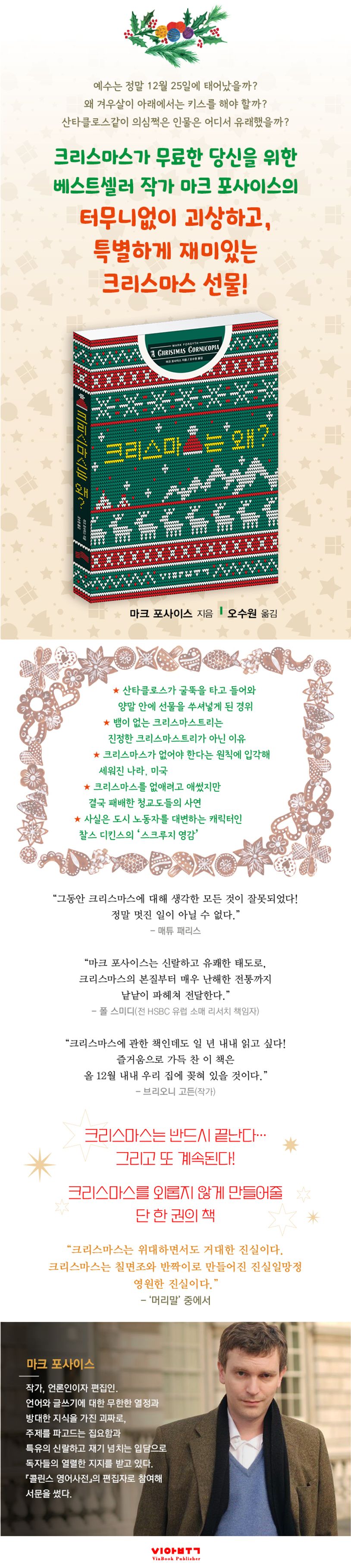 다행히도, 같은 의문을 가진 사람이 또 있었으니. 그 사람이 바로 마크 포사이스라는 사실은 또 얼마나 다행스럽고, 설레는 일인가? 『문장의 맛』, 『걸어 다니는 어원 사전』으로 국내에도 널리 알려진 베스트셀러 작가 마크 포사이스가 준비한 특별한 크리스마스 백과사전, 『크리스마스는 왜?』가 출간되었다. 특유의 입담을 뽐내며, 누구나 한 번쯤은 궁금했을 이야기와 일평생 궁금해해 본 적 없을 이야기들을 뒤쫓는다. 술술 흐르는 재담에 홀려 숨 가쁘게 도착한 책의 끝에는 어떤 결론이 기다리고 있을까? 주의하시라. 이 책을 펼친 순간부터 다시는 크리스마스를 예전과 같은 마음으로 볼 수 없을 테니.