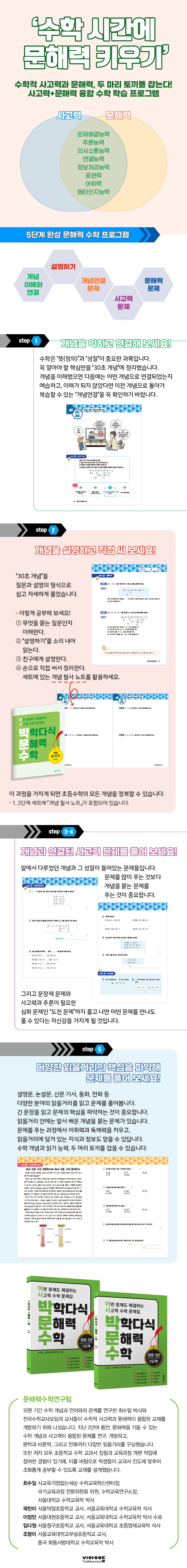 지식이나 정보가 폭발적으로 증가하는 사회에 능동적으로 대응할 수 있는 역량을 갖추는 공부가 절실히 필요한 때다. 수학 개념을 정확하게 논리적으로 설명할 줄 아는 공부야말로 미래를 준비하고, 대처할 수 있는 능력을 키워 줄 수 있다. 『박학다식 문해력 수학』은 수학 교육과정에서 요구하는 5대 역량과 ‘설명하기’를 통해 학생이 개념을 충분히 인지하였는지를 알 수 있는 메타인지능력, 그리고 문해력을 동시에 키울 수 있는 교재다.