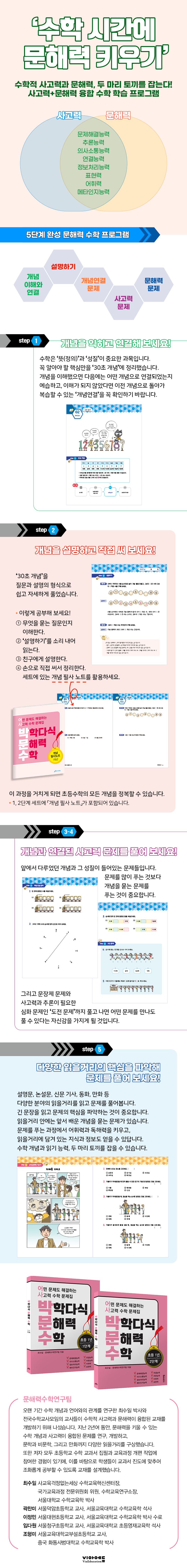 우리나라는 OECD가 학생들을 대상으로 실시한 국제학업성취도평가(PISA)의 읽기 능력 중 ‘비판적 문해력’ 항목에서는 4명 중 1명만 정답을 맞혀 거의 꼴찌 수준을 기록했습니다. 특히 초등학교 수업 현장에서 질문을 이해하지 못해 수학 문제를 풀지 못하는 아이, 단어의 뜻을 몰라 선생님 설명을 이해 못 하는 아이, 교과서 읽기를 힘들어하는 아이를 많이 목격합니다. 수학은 언어 능력과 밀접한 관련이 있습니다. 수학 개념은 모두 글로 표현되어 있고, 문장을 읽고 이해해야 풀 수 있는 문장제가 최근 시험에 많이 출제되고 있습니다. 그리고 많은 연구 결과, ‘어휘적용’과 ‘언어추리’ 등이 수학 실력과 많은 연관관계가 있다고 밝혀졌습니다. 문해력이 수학 실력을 좌우하는 시대입니다. 그래서 오랜 기간 동안 수학 개념과 언어와의 관계를 연구한 최수일 박사와 전국수학교사모임의 교사들이 교재 개발에 나섰습니다. 지난 2년여 동안, 문해력을 키울 수 있는 수학 개념과 사고력에 기반한 문제를 연구, 개발하고, 문학과 비문학, 그리고 만화까지 다양한 읽을거리를 구상했습니다. 또한 저자 모두 초등학교 수학 교과서 집필과 교육과정 개편 작업에 참여한 경험이 있기에, 이를 바탕으로 학생들이 교과서 진도에 맞추어 조화롭게 공부할 수 있도록 교재를 설계했습니다. 시중에 문해력이라는 이름을 달고 많은 문제집이 나와 있지만, 예전 국어나 독해 교재를 제목만 바꾼 것이 대부분입니다. 이와 다르게 『박학다식 문해력 수학』은 수학 개념과 사고력을 키우는 동시에, 일상생활에서 중요한 정보나 사실을 찾아내고, 판단하고, 소통하고, 연결하는 능력까지 훈련할 수 있는 신개념 교재입니다.