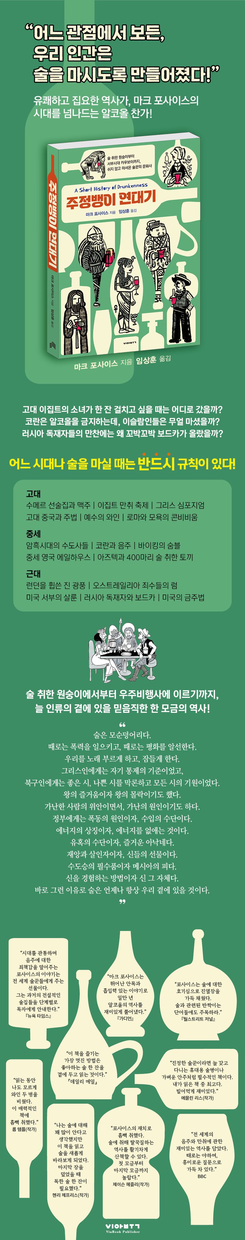 미국의 벤저민 프랭클린은 “좋은 술이 없는 곳에 좋은 삶이란 없다”라고 말했다. 중국의 장자는 “술 마시는 꿈을 꾸는 사람은 아침이 밝으면 슬프다”라며 한탄했다. 술이 부르는 다양한 사건과 사고에도 불구하고 술꾼들은 말과 시, 노래로 끝없이 술을 찬양했다. 취기에 기대 과거 주당들이 어떻게 술을 사랑했는지 진지하게 궁금해하기 시작했다면, 저 술집 구석에서 당신을 향해 비틀비틀 걸어오는 마크 포사이스의 이야기에 귀 기울여 보라. 술꾼들의 역사와 문화에 관해서라면 그를 따라올 자가 없을 테니 말이다.