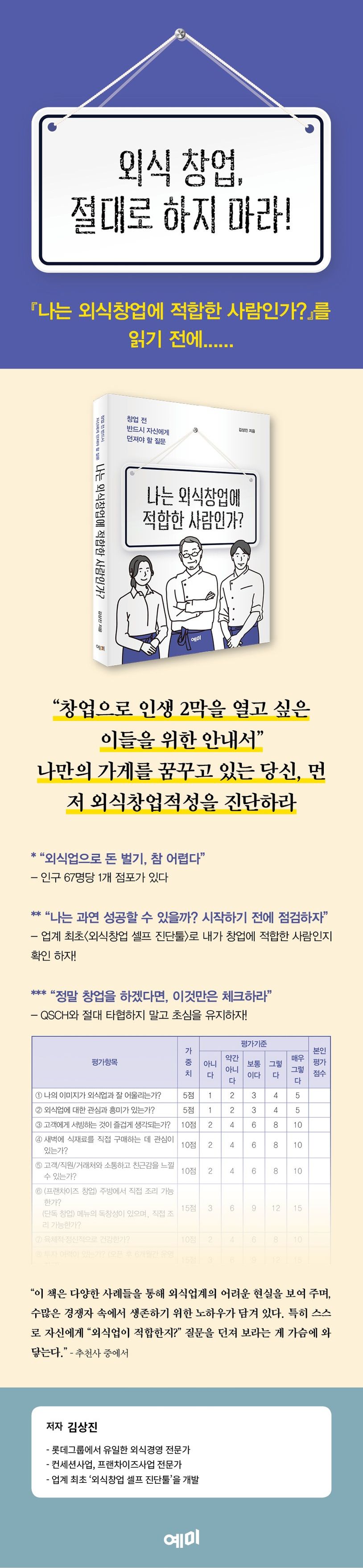 외식창업, 과연 나는 이 바닥에서 성공할 만한 자질을 갖추고 있을까? 외식창업에 대한 현실을 잘 모르고 막연히 자신의 가게를 꿈꾸는 이들에게 팩트 폭격을 아낌없이 쏟아붓는 동시에, 그럼에도 꼭 창업을 하고 싶다면 무엇을 주의하고 준비해야 하는지 상세히 알려주는 책이다.