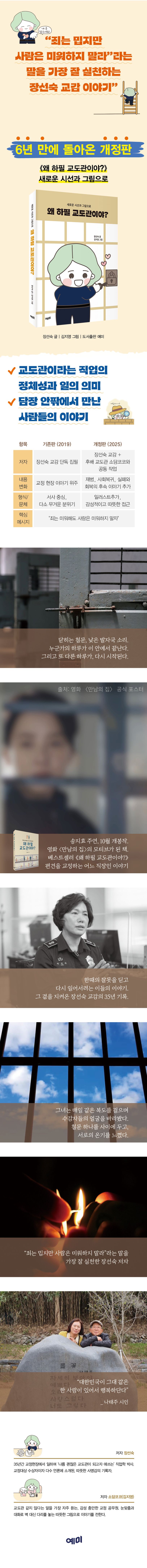 교도관이라는 직업의 의미와 보람, 고민을 진지하면서도 위트 있게 풀어낸 에세이 《왜 하필 교도관이야?》가 새로운 시선과 그림으로 다시 독자들을 만난다. 6년 만에 교정의 날을 맞아 펴낸 개정판에서는 첫 책 이후 달라진 사정들과 등장인물들의 이후 변화, 그리고 목소리를 더 키우고 싶은 부분에 대해 추가하고 수정 보완했다. 그리고 무엇보다 그림 그리는 후배 교도관의 삽화를 더해 보다 생생하게 담장 안 하루하루를 전달해 준다.