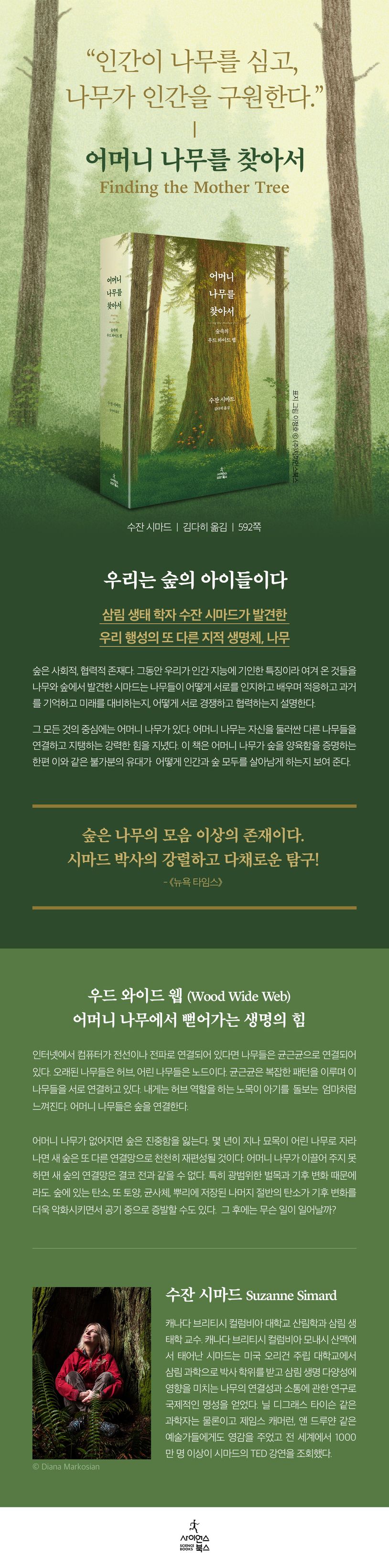 내 책으로 말미암아 한국의 독자들도 어머니 나무들을 발견하고 돌보고 싶게 된다면 얼마나 좋을까! 여러분도 어머니 나무를 찾는 모험에 동참하면 좋겠다. 숲에서 가장 큰 나무를 찾았다면 그 나무가 바로 어머니 나무이다. 어머니 나무는 숲을 기른다. 어머니 나무는 숲을 되살아나게 한다. 이 책을 실마리 삼아 숲속을 나아가다 여러분의 어머니 나무를 만나게 되기를 바란다.-본문에서